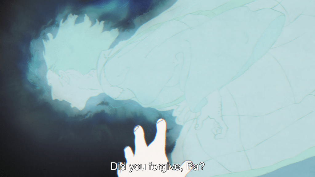 Tokuko’s forgiveness is equally transformative for Biwa, with whom she shares her vision for a different kind of world. The young girl is thrown into inner turmoil as she listens to Tokuko, her desperation for a world in which forgiveness is possible bubbling to the surface. When Tokuko speaks of forgiveness, Biwa sees the ghosts of her Pa and Shigemori, her adoptive father-figure, and asks them if they forgive. The implication is clear: Biwa wants to know whether they forgive her. After all, it had been her mouthy defiance that got her father executed, while she may well believe that she could have done more to save Shigemori, given her gift of supernatural foresight. In both cases, Biwa had remained an observer, frozen in inaction as they breathed their last.