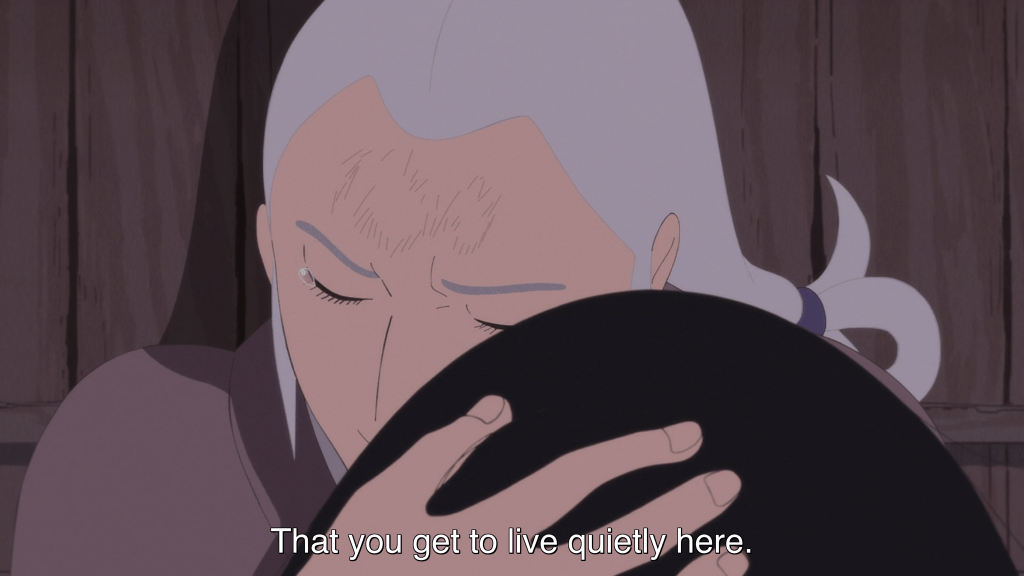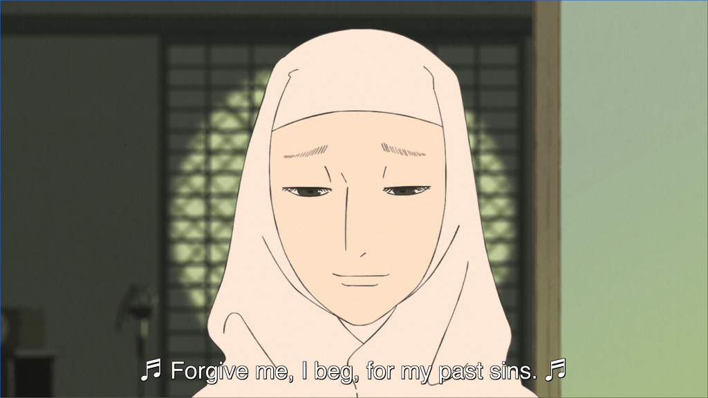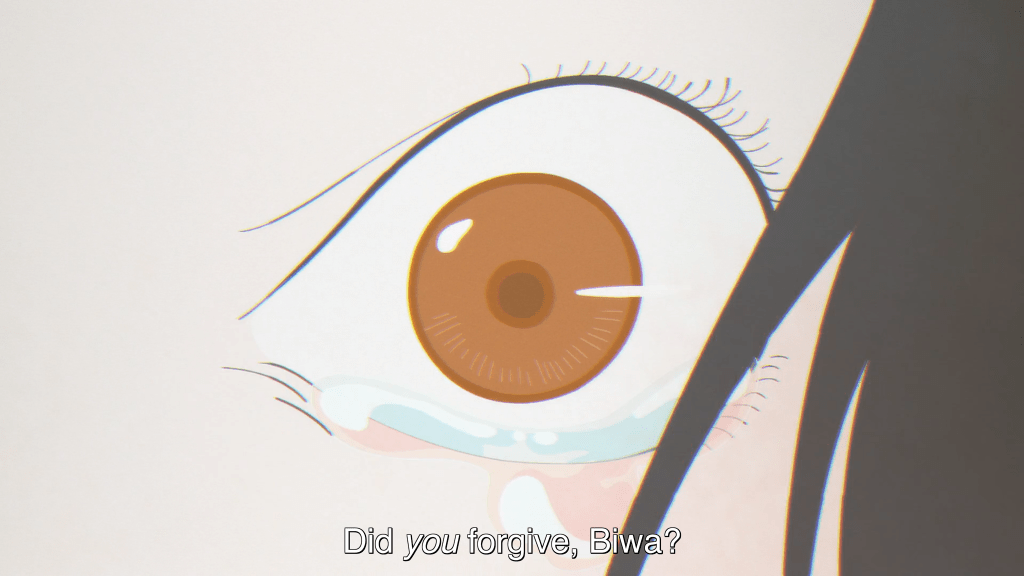 Spanning several episodes, Biwa’s journey reminds us that forgiving is not something we just happen upon incidentally. It doesn’t come naturally. Instead, it’s something that must be sought out, sometimes for months or even years before that sudden realization comes that we’ve finally found it, we’re living in it at last. (I’m talking here, of course, about forgiveness for the major hurts and wrongs that we’ve suffered in life and not the smaller day-to-day things for which forgiveness can become far more habitual and easy, by God’s grace.)