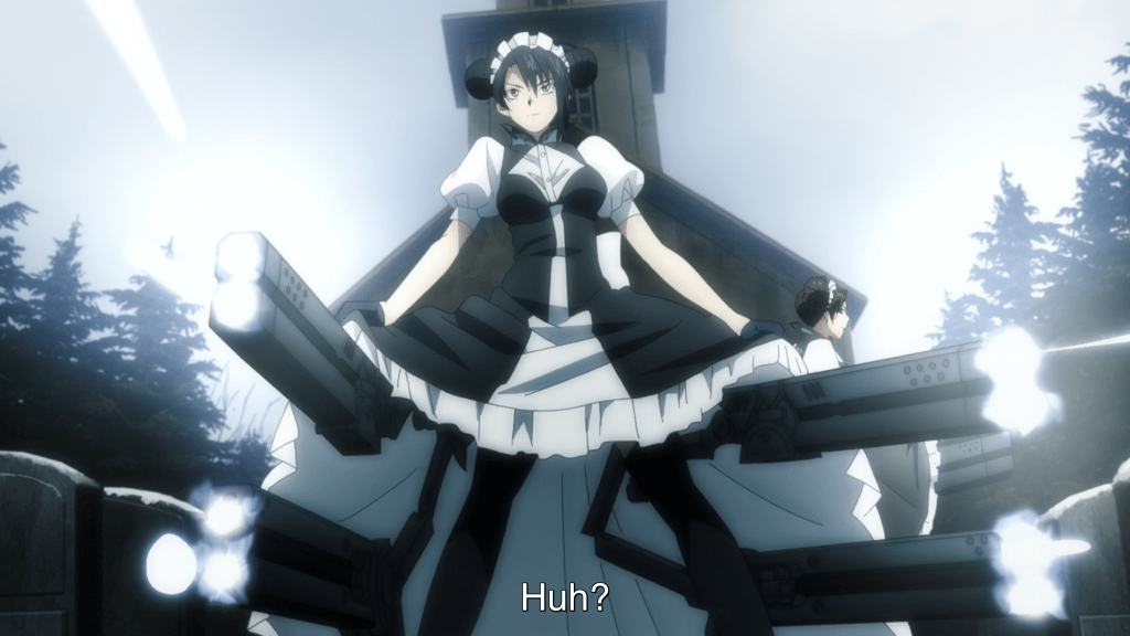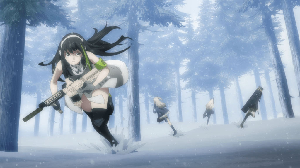 A stunning opening sequence follows on the heels of a weak, info-dumpy opening scene that’s there to let us know that in 2045 WWIII began and was fought exclusively by android Tactical Dolls that are indistinguishable from young human women. Seventeen years later, the T-dolls are still duking it out, Griffin (good guys) vs Sangvis (baddies). Our girls, four Griffins who are not like the others, are infiltrating enemy territory to retrieve some data off an old-fashioned piece of technological hardware known as a desktop computer. They must foil the enemy’s traps along the way, and then use their keen tactical abilities to outmaneuver a superior force that lays siege to them as they transfer the data with painstaking slowness — must be USB 2.0. The enemy sends in a High-End Agent model whose sinister personality and considerable brute force factor are clearly conveyed by her maid outfit. Successfully surviving the siege, the team is fleeing Sangvis territory when they stop at a church where the entire congregation has died, judging by the density of gravestones in the front yard. Here, they are set upon by not one, but two enemy maids! This is a dire situation because—sorry for not saying this before—beneath their skirts, the maids sport not one, not two, not even just three, but four machine guns. That’s eight machine guns. Our girls are doomed! Except that they have superior tactical skills (did I mention that?) and enough experience working together that they do not rely on the matrix, er, the Zener Protocol system that I think links their thoughts but can be (and was) hacked. Woot! Take that, machine gun maids! Now the girls must split up in order to complete their mission. Death flags???