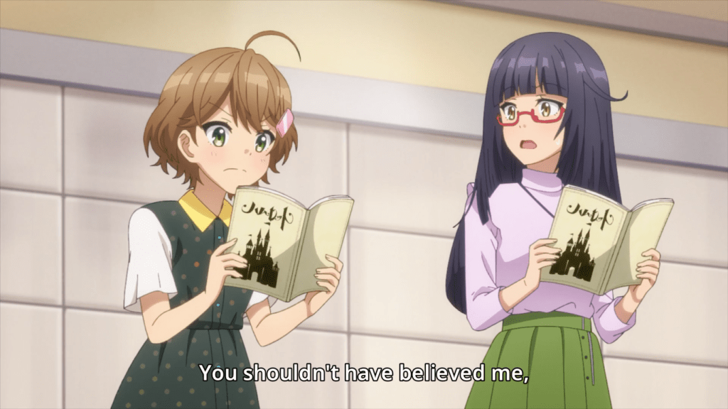 I’ll confess I was skeptical that a show with this number of heroines could make any sense at all, and my excess-of-cuteness detector was sounding somewhat of an alarm. And, indeed, without the documentary trick of The Idolm@ster’s first episode, when everyone arrived at the studio all at once, it felt quite like Paprika’s endless parade. But after that, the show managed to find its feet and ease my concerns. It was very helpful that the personalities of our four main protagonists were effectively established early on, and the Hamlet acting scene served well to give a quick overview of the quirks and traits of the rest of the cast. Suddenly, everything felt more or less as it did when I tried acting at university. It may be only my impression, but the brand-new agency looks more suspicious than its Idolm@ster counterpart (an angle I’d love to see explored), with its CEO constantly surprising everyone, coach included. There seems to be more to the coach herself than meets the eye, too. Some conversations about insecurities that one wouldn’t normally have in front of everyone did throw me off a little, but the voice acting scenes themselves were so beautiful, and felt so much like acting, that my impression ended up being very positive. Things could still go wrong, but I’m cautiously optimistic about this one.