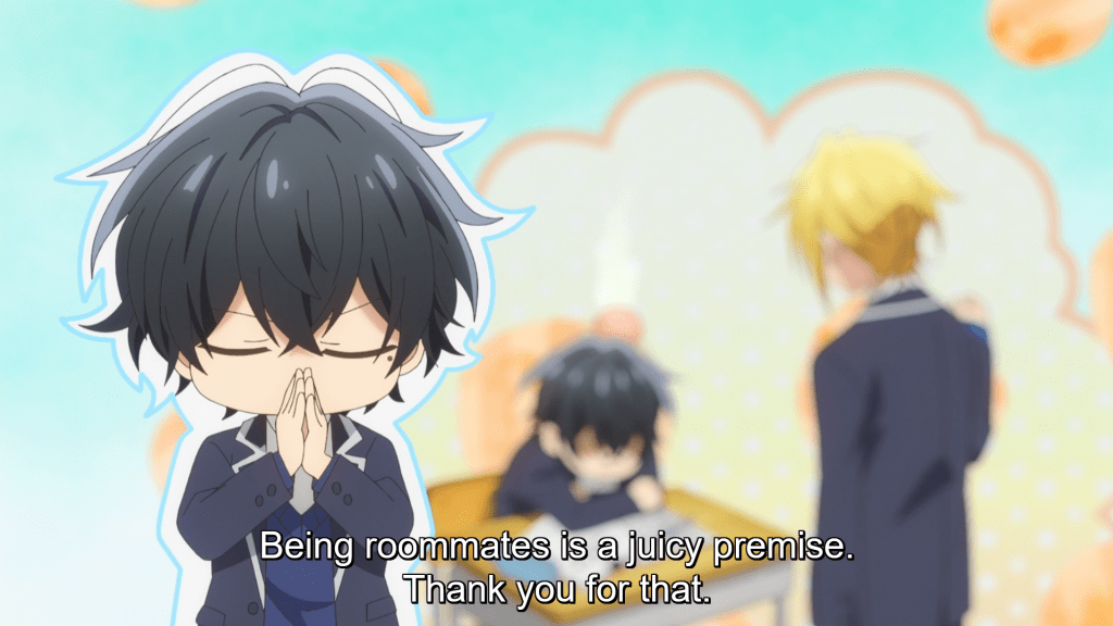 From the first scene, this new shounen-ai series reminded me of last year’s anime romance, Horimiya. Both have beautifully drawn characters but employ a cutesy style, and are told in vignettes rather than episode-long stories. But further, these two series share this wondrous, vibrant animation style, with Sasaki and Miyano frequently making use of bursts of flowers and bubbles (like you might see in an overlay in a photo editing app).