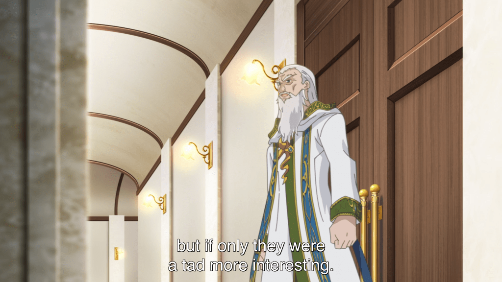 Maybe the main theme is the genderbend, our male MC who used to be a stately old man in game and is now a cute girl. But if that were the case, then surely it would have taken the MC longer than one episode to earn back his place at the King’s right hand. Give the guy more than just a peeing scene for the implications of being a woman in a fantasy gameland scenario to sink in…