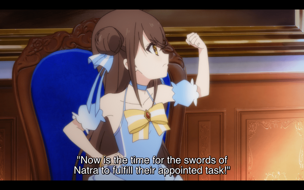 Wein (pronounced like “wane” rather than “wine”), crown prince of Natra, epitomizes the idea of being too smart for one’s own good. With his father the king in poor health, Wein is in charge of his small, impoverished kingdom, but in his heart of hearts, he’d much rather just live a life of laziness and ease. Unfortunately, Natra is currently too poor even to sell out to another country. In private, Wein is whiny, but when he’s on the job, he’s not just competent, he’s amazing. He may begrudge his responsibilities, but he does fulfill them. His attempts to minimize the scale and duration of the war are interpreted as genius moves by his subordinates, whose perspective is validated when Wein’s army trounces invaders from a neighboring country in battle, then goes on the offense and captures a strategic location in enemy territory. The episode also introduces several other potential plot threads: Wein’s adorable little sister Falanya, the fact that Natra is welcoming toward a widely despised racial minority (the Flahm are basically fantasy Jews with albinism as an ethnic trait), and the death of a major empire’s leader has just died.
