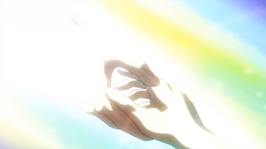 But I’d like to go back to a giant—a gentle one. In the opening, Haruhi looks at the sky. And then a hand reaches out to hers, and the deep and miraculous adventure begins.