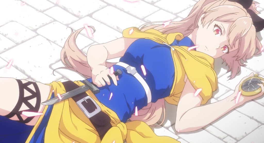 When Mitsuki is isekai’d into a fantasy world, he believes this is his chance to live a changed life, perhaps through some unknown power flowing into him. Wait…this isn’t that type of story at all. Mitsuki is actually booted from the castle in which he appears, and is discovered by the priestess Menou, who kindly attends to him and explains the situation—that he is a “Lost One,” a human from another world, and that her church will take him in. Wait…it isn’t that kind of anime either. This time, I’ll tell you the tale—but warning, major first episode spoilers ahead, ones that are worth discussing, though, and which will be the focus of the short analysis below. Mitsuki discovers that he does actually have an incredible power, but before he’s able to use his “Pure Concept” for his own benefit, Menou stabs a knife into his skull. She, as it turns out, is an executioner, one who assassinates “Lost Ones” for the church in order to preserve the world. Her next target? The girl, Akari, summoned along with Mitsuki, and held captive in the King’s castle.
