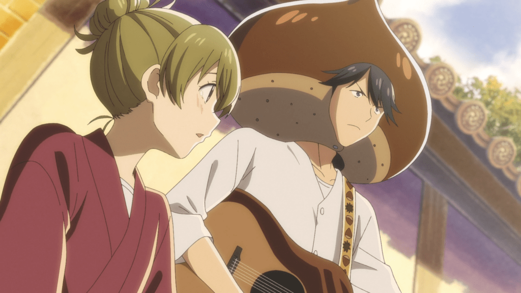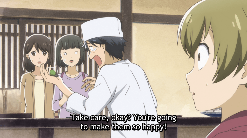 What a beautiful anime! The artwork is a delight of soft watercolor washes, rich backgrounds, and subtle expressions. I didn’t spot even a single janky inbetween. Definitely a nice bit of promotion here for the old part of Kyoto, with its charming wooden buildings and luscious plant life peeking up between the cobbles. The sound design too is worth highlighting: before even taking in the visuals, you are drawn into the world of Ryokushou through the soft sighing of the spring breeze, the chirping of the birds, and the sounds of the artisanal quarter coming to life. I was a little worried, during previews a few weeks ago, that the story and characters themselves may be a little too sweet, but that is not the case. The writer responsible for series composition, Reiko Yoshida, has pitched things perfectly so far, providing just the right amount of suspense, with a dash of peril, alongside the humor, and transforming this from what could have been merely a pleasant but forgettable confection into a drama that has serious potential. Judging by the ED animation, there is a whole cast of characters yet to be introduced who will also be soothed and inspired by their encounters with the delicacies and denizens of Ryokushou. I, for one, cannot wait for the next episode!