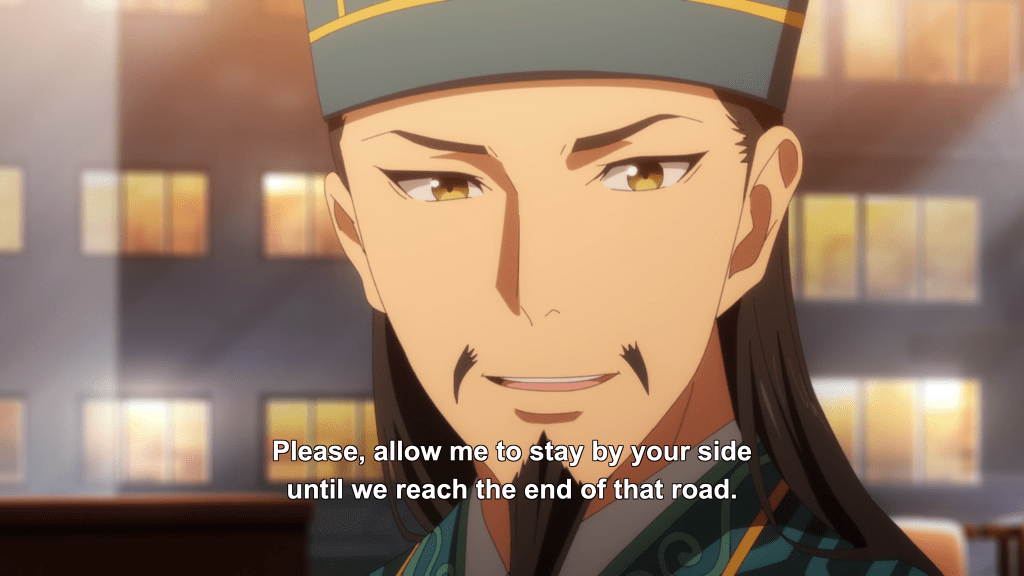 There’s something really beautiful that happens in this final exchange between the two. Kongming speaks of Eiko’s relationship with music as a “water-fish fellowship”, explaining that it means “having a friend who is indispensable”. Here, he’s honoring her dream, and its importance in having helped her through the rough times in her life, before he was a part of it. But Eiko’s eyes and heart have been opened this episode; she has grown in her trust of Kongming. And she recognizes that it is he who is her water-fish.