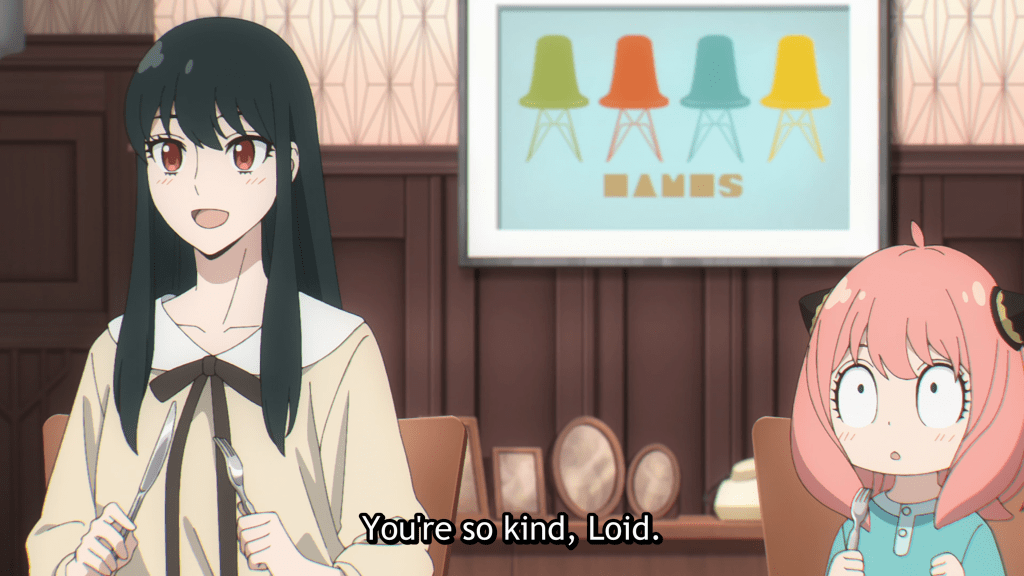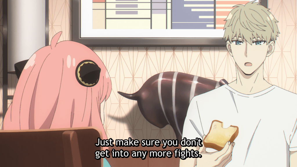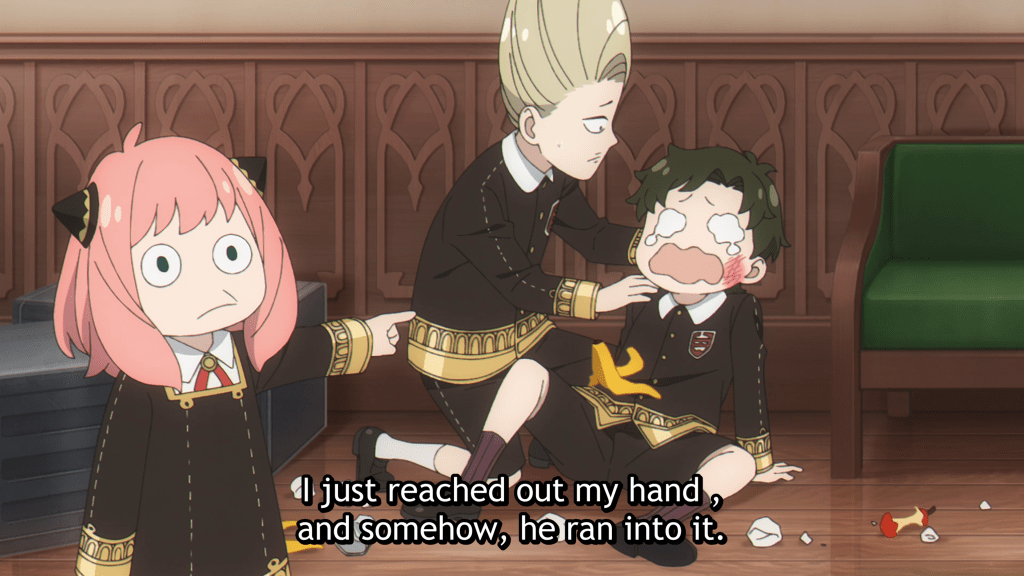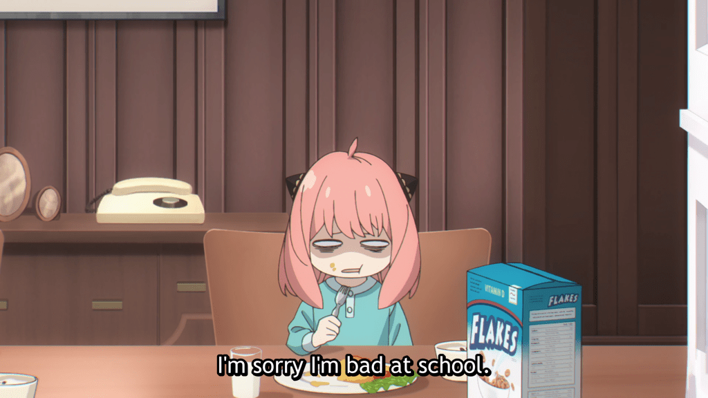 The morning after her altercation, this is exactly what Anya does as she cuts herself off and accepts shame as her just deserts. She is uncharacteristically reluctant to join the breakfast table, hanging her head low and refusing to meet her parents’ gaze. She is self-deprecating, her shoulders hunched over as if to make herself as small as possible in hopes of disappearing before what she doubtless expects will be an onslaught of well-deserved reprimand from Loid. She tries to beat him to it and starts to accuse herself.