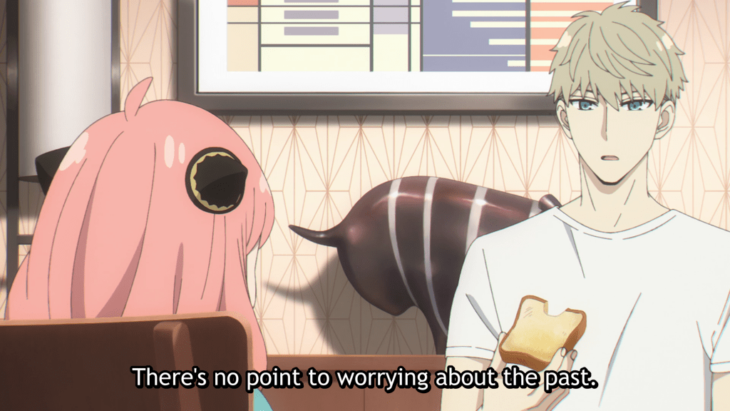 But when Loid speaks, he flips the script. Instead of a tongue lashing, Anya gets an invitation, a promise, and an encouragement: “Come on out. I won’t get mad. …There’s no point in worrying about the past,” says Loid. When the correction comes, it turns out to be pretty mild, which makes it all seem so…manageable: “Just make sure you don’t get into any more fights,” he says, before concluding, “cheer up”.