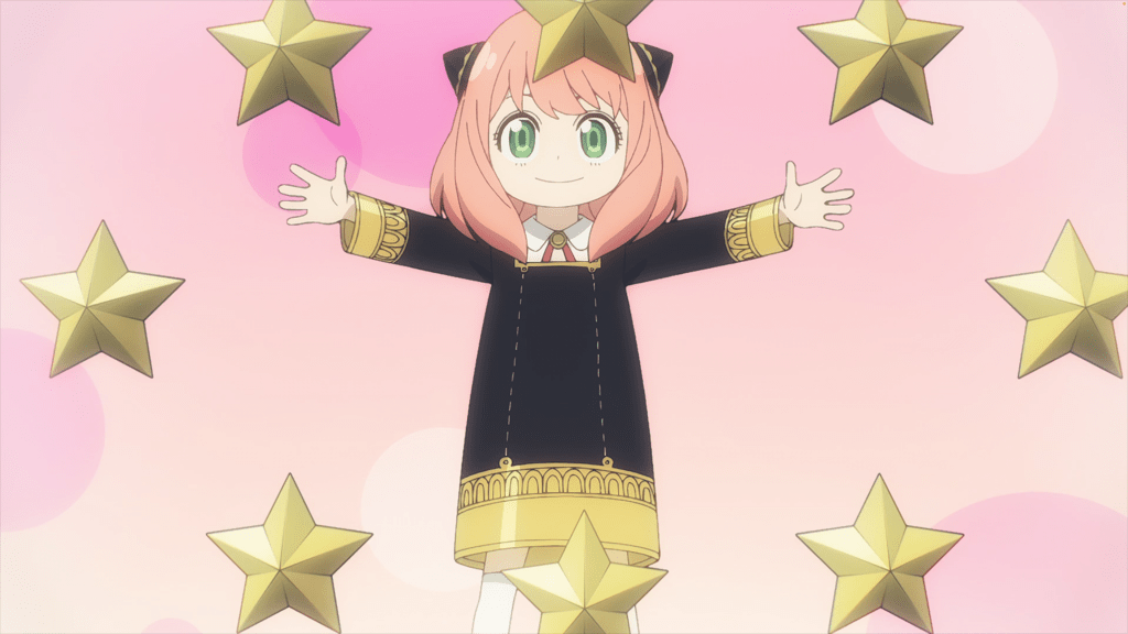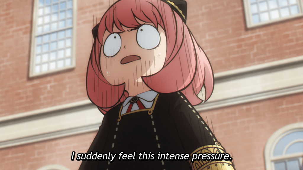 Only Anya is in the know, thanks to her aforementioned ability. Not just about her “parents’” secret identities, but also about the pivotal role she is intended to play in safeguarding world peace. Although Loid has of course not discussed it with her, she’s heard him thinking about it constantly. And so it’s a burden of awareness that she carries alone, freaking out expressively, if silently, every time she’s reminded by Loid’s thoughts of what all is at stake each time the teacher calls on her, every pop quiz she fails, and with every taunting encounter with Damian and his henchboys.
