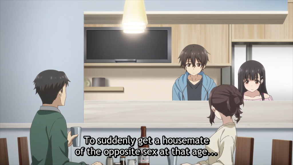In middle school, framed now in glorious golden light, Yume Irido used to be Yume Ayai, the timid girl with glasses who dated the clumsy and smiling Mizuto Irido. Born the same day, going to the same class, their love looked like destiny. But in time, he became this passive-aggressive teenage otaku with a genius complex, while she became a beautiful and manipulative social star, and they broke up. And then, without prior notice, Mr. Irido, a widower, married Mrs. Ayai, a widow. As the children had kept their parents in the dark about their relationship (talk about fearful symmetry), they are now quarreling and bickering in secret, while pretending that everything is A-OK in front of the happy couple. Things work out until they decide to make a bet to decide who will address the other as Onii-san or Onee-san: the one who “fails to behave in a sibling-like manner” towards the other, even in private, will lose. Make of that what you will.