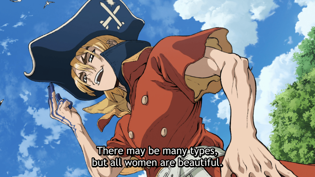 I would be remiss if I didn’t talk about our title character. No, not Dr. Stone. That’s a bar of soap. I’m talking about the OTHER title character—Ryusui. From the moment we meet him, we get the feeling that this guy is a real piece of work. He comes off as being very braggadocious, spoiled, and self-assured. In a way, he’s pretty much the kind of guy Tsukasa, the absurdly strong high school student from the “Stone Wars” arc, was trying to PREVENT coming back into power. Heck, the man wants the rights to the oil fields that they find, IF they find any, and he goes so far as to institute a financial system in the form of the Draco based on the backing of that oil. Who does that?!