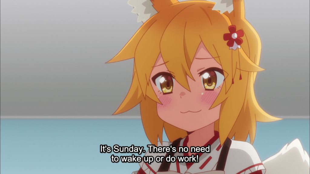 Isekai slice-of-life is not the only place you will find this theme of finding rest. This theme pops up in various other slice-of-life series taking place in the modern world, like The Helpful Fox Senko-san, in which an 800-year-old fox goddess helps an overworked salaryman relax when he gets home. In this case, rather than trying to directly resolve his working situation (at least at first), Senko aims to get the worker, Nakano, to get more rest during his time at home by putting work and other stressful things out of mind and accepting her pampering. The show is a reminder that rest goes beyond simply working fewer hours and includes what we do with our time off the clock.