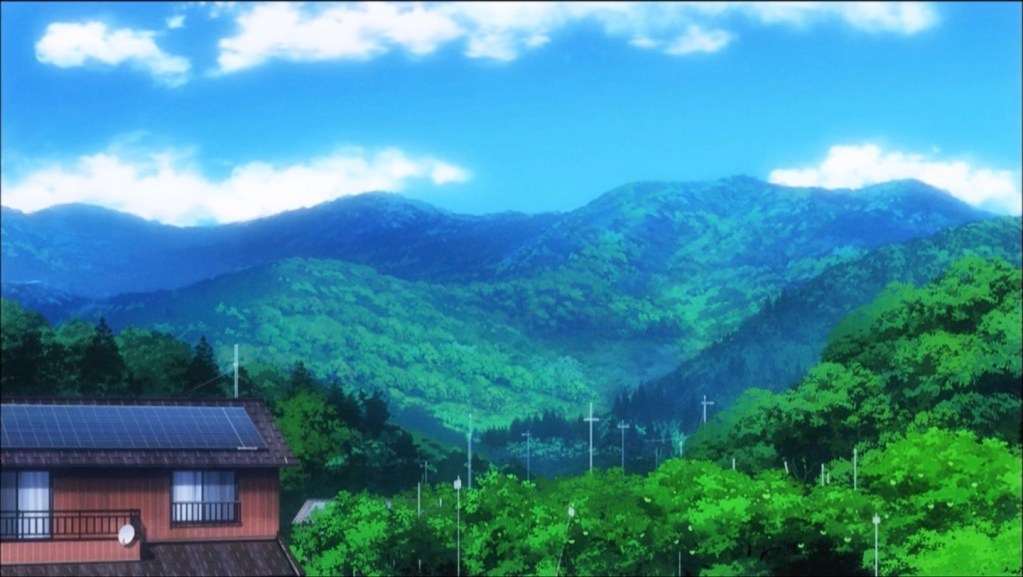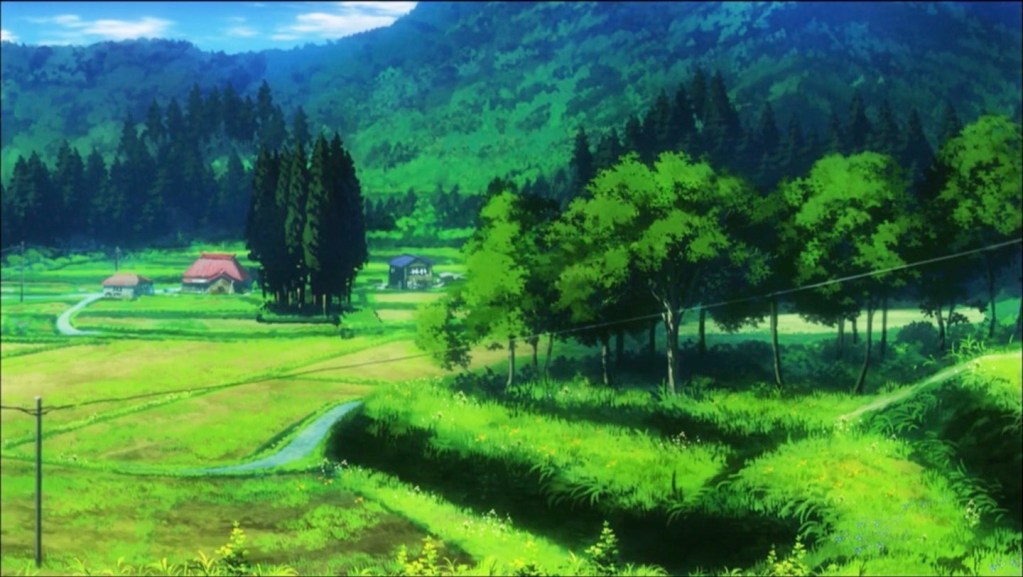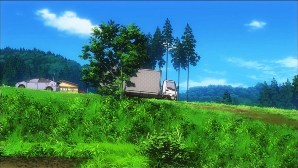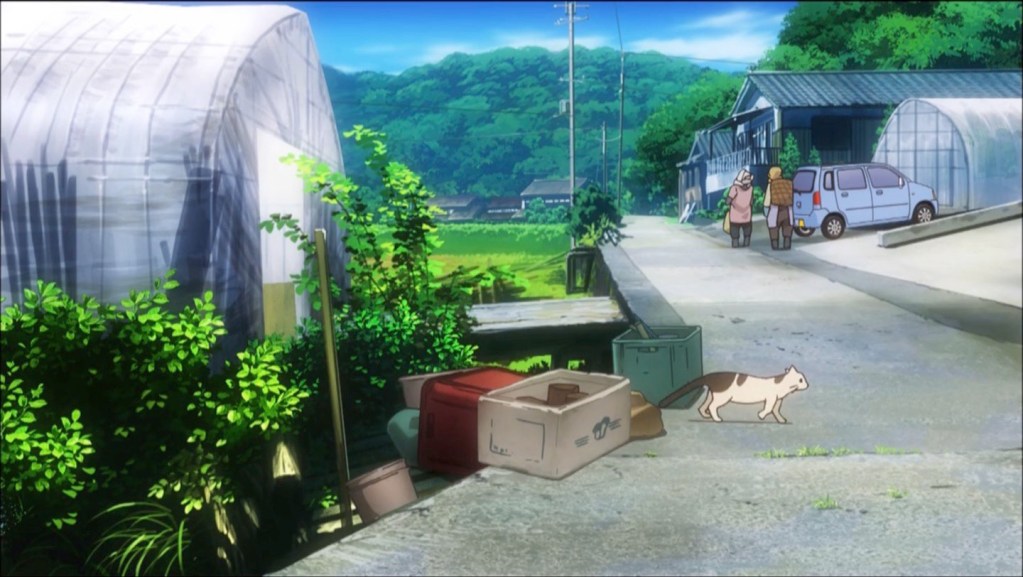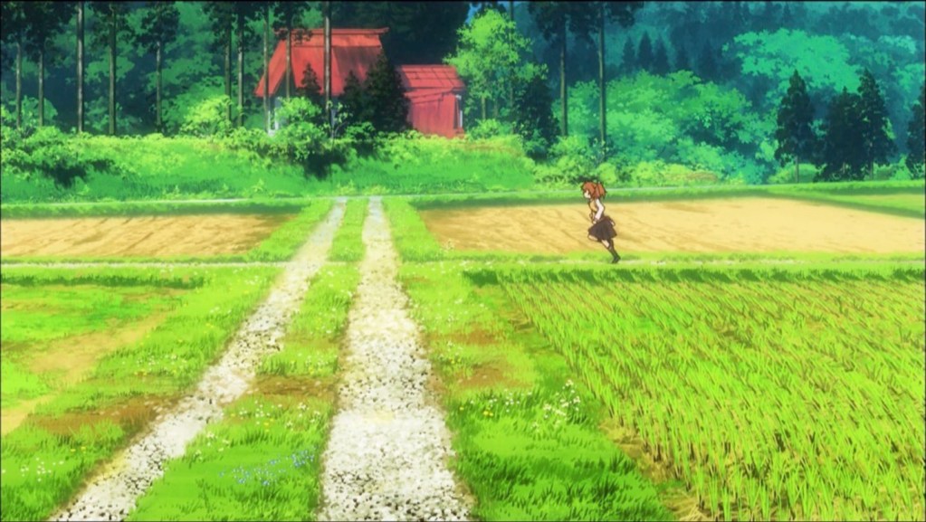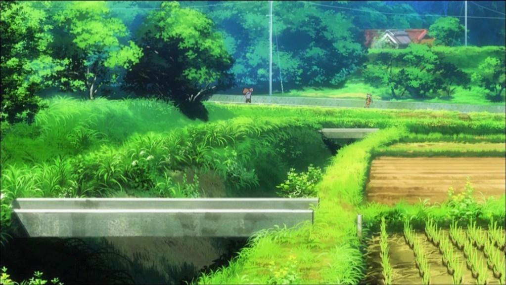 This rhythm is clear from the very first episode, which opens with what is in effect a three minute pause: a visual essay on the beauty of nature that eases viewers into life in Asahigaoka through successive shots of the hills and valleys, brooks and roads, outbuildings and homes that constitute this humble village. These images acquaint us with the topographical rhythms of the land long before we encounter its people. Cars, trucks, and tractors travel its reaches placidly and buildings dot the horizon, all testifying to a human presence, but there is nevertheless a timeless feel to it all. When we do at last see the children around whom the series revolves, it is from a distance or up on high. We are sharing the perspective of the village itself, which encompasses sky above and valley low. It is a gaze that is patient, affectionate, and full of life.