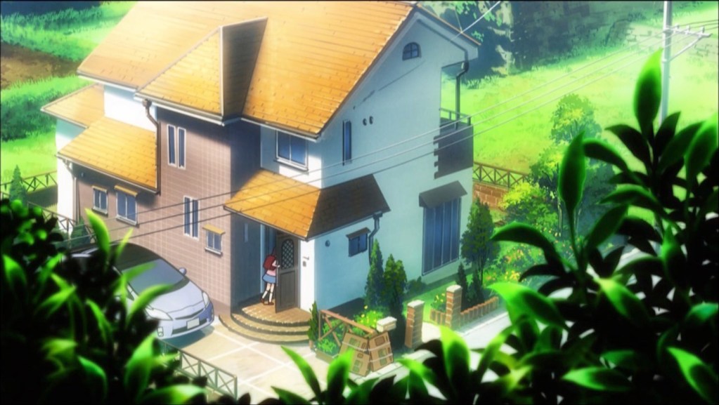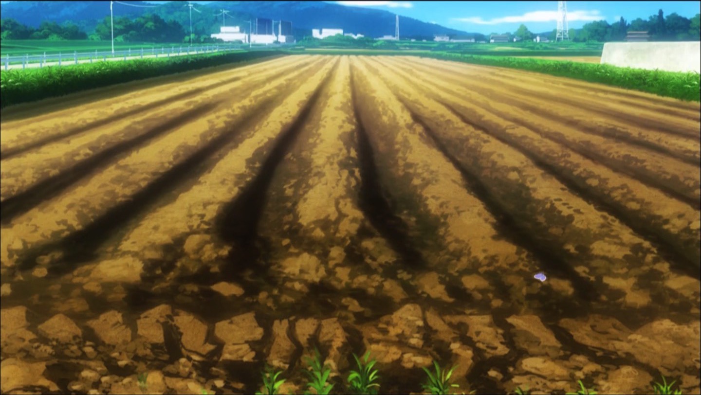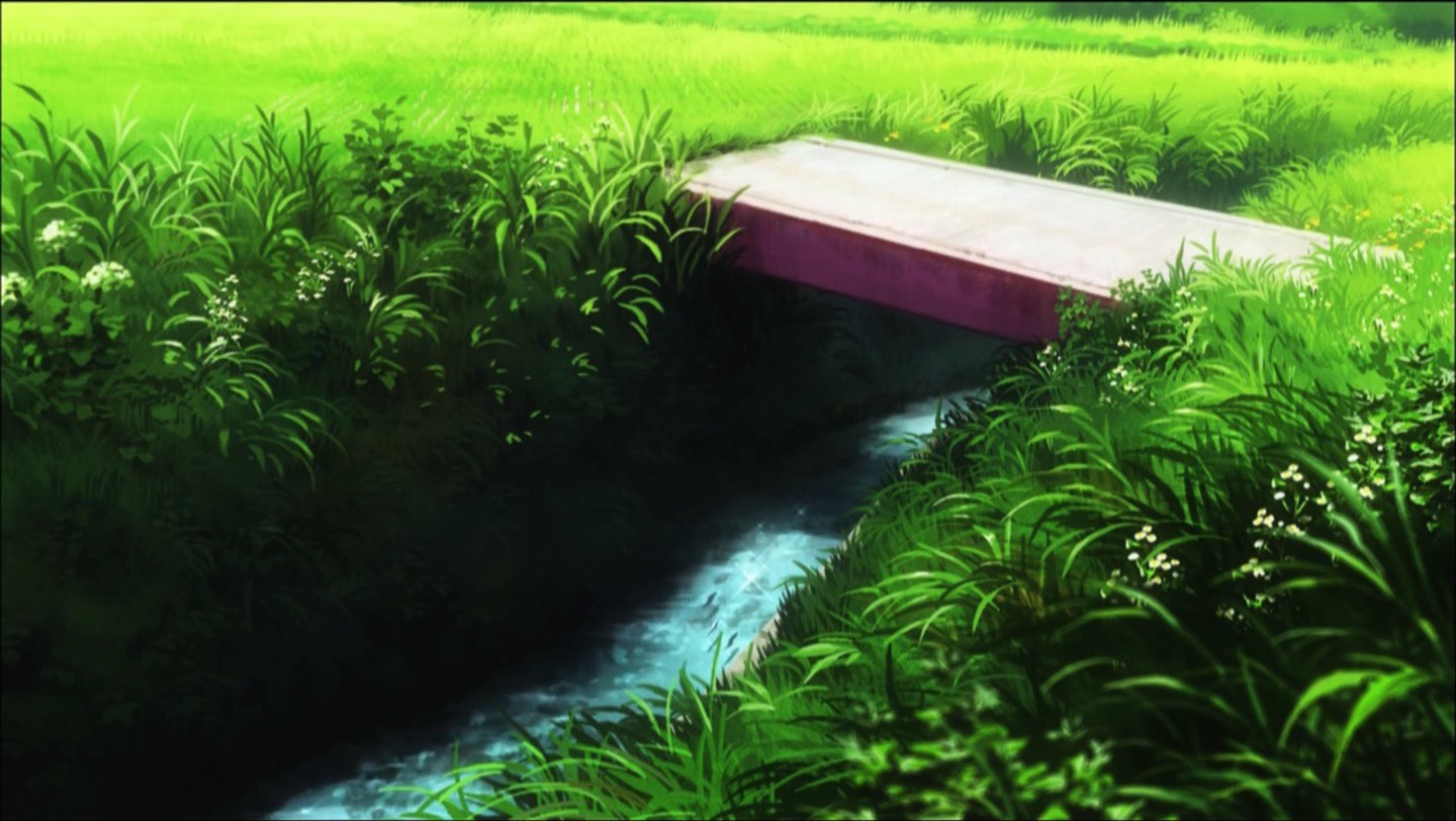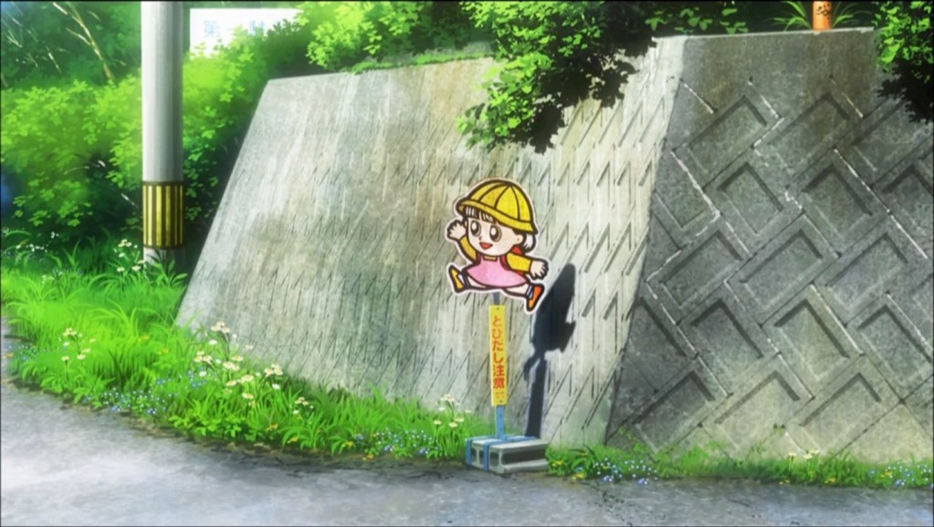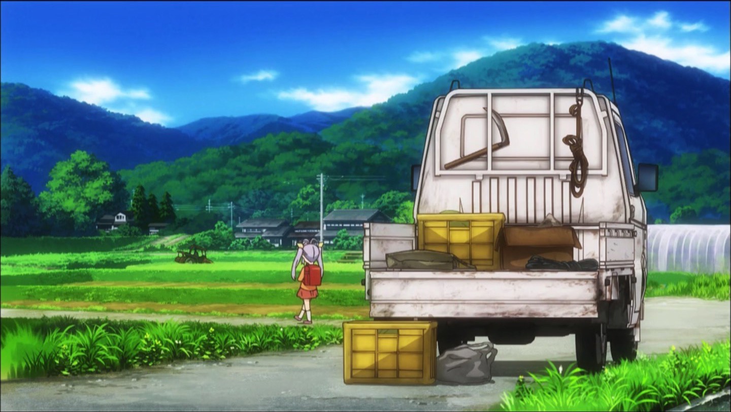 This rhythm is clear from the very first episode, which opens with what is in effect a three minute pause: a visual essay on the beauty of nature that eases viewers into life in Asahigaoka through successive shots of the hills and valleys, brooks and roads, outbuildings and homes that constitute this humble village. These images acquaint us with the topographical rhythms of the land long before we encounter its people. Cars, trucks, and tractors travel its reaches placidly and buildings dot the horizon, all testifying to a human presence, but there is nevertheless a timeless feel to it all. When we do at last see the children around whom the series revolves, it is from a distance or up on high. We are sharing the perspective of the village itself, which encompasses sky above and valley low. It is a gaze that is patient, affectionate, and full of life.