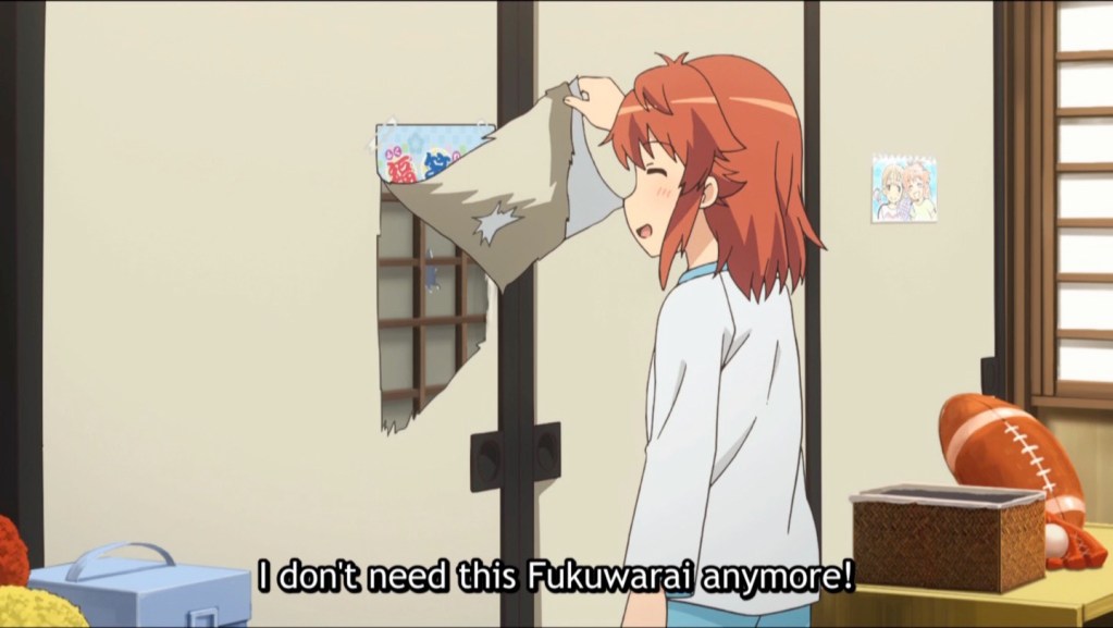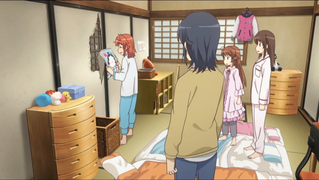 For instance, there’s the time when Natsumi mistakenly believes that she has damaged the shoji or paper screen in her bedroom and tries to cover it up, only to learn from her mother that she was the one who had made the hole. In her relief, Natsumi triumphantly rips off the poster she’d used to cover up the hole, thus inadvertently tearing away a huge chunk of the paper. The characters just stare at the gaping expanse in disbelief. But here’s the thing: no one yells or berates Natsumi.