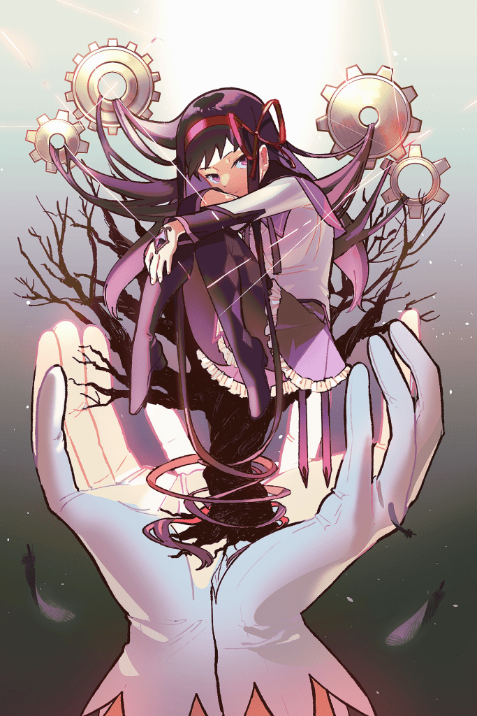 Ripe with metaphor, this illustration of Homura Akemi captures the character’s strength as well as the machinations and desires that drive her. Essay, anyone?