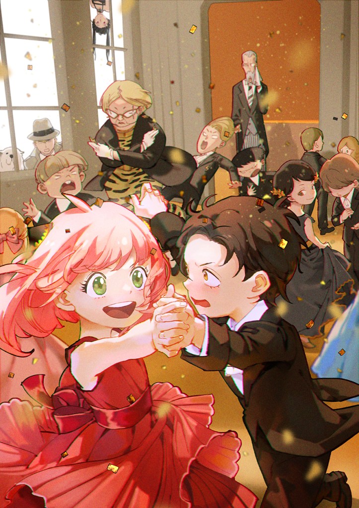 Damian’s face in this illustration! And all the characters watching from behind (see Yor?). I LOVE IT.