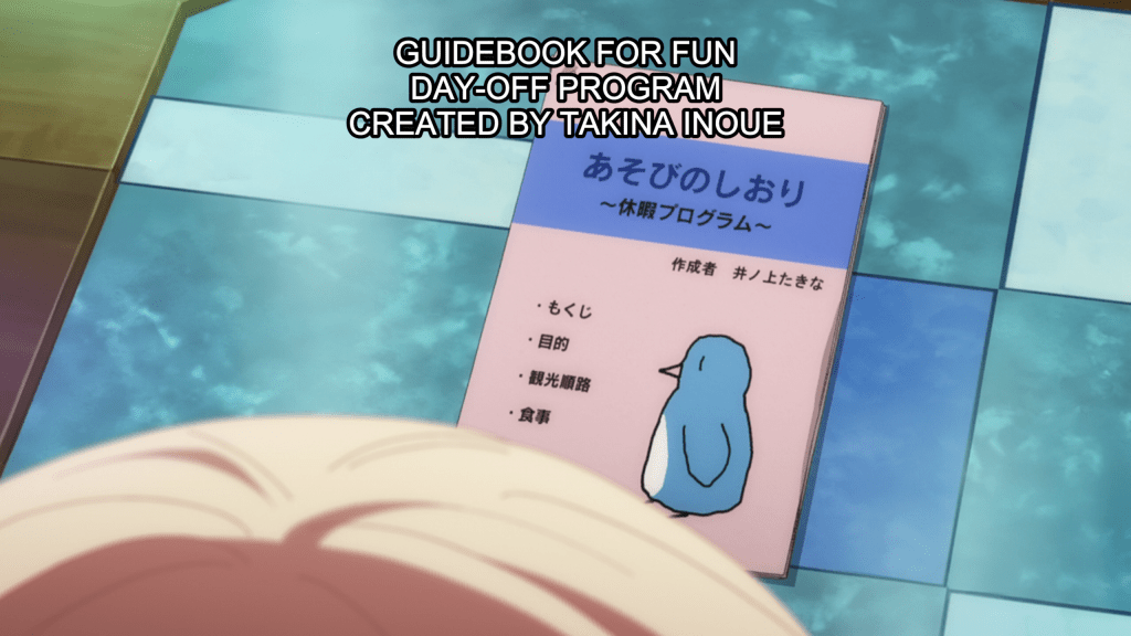 As the LycoReco team comes to terms with cold hard reality, as well as Chisato’s backstory, they devise a plan to pursue the one possibility that remains for extending Chisato’s life: find Yoshi-san, the originator of both Chisato’s artificial heart and the order to render it non-functional. To do this, Takina needs to accept the DA’s offer to rejoin Lycoris HQ. She of course determines to bite the bullet right away and what follows is the most INTJ Takina-like montage ever as she plans and executes the most efficient, productive ‘fun’ day possible for Chisato before breaking the news of her imminent departure for HQ.