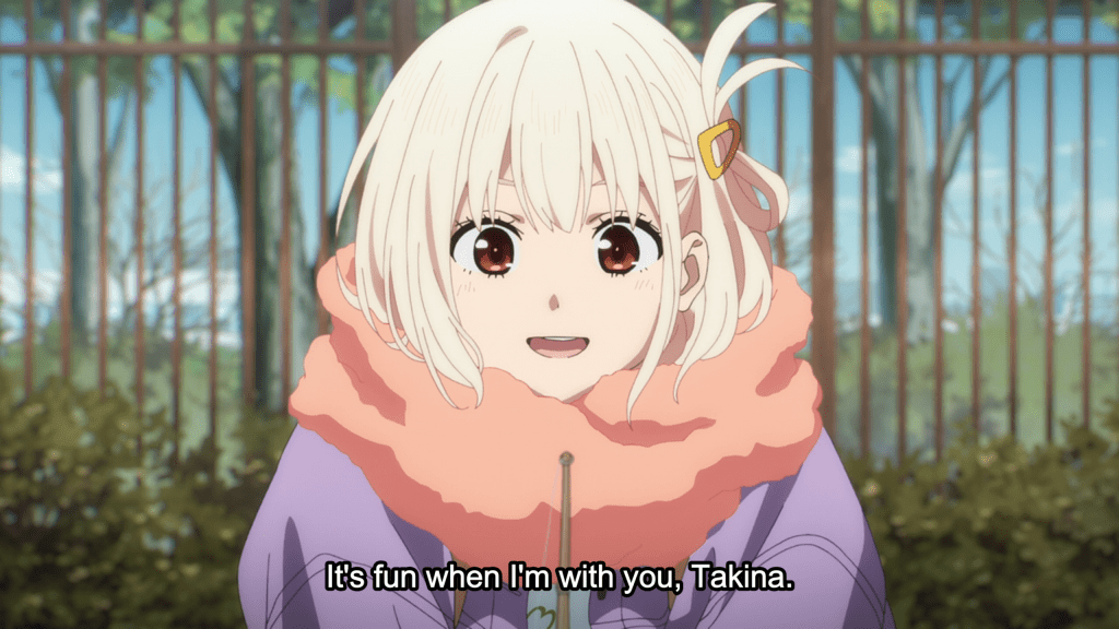 And so instead of reprimand or teasing, Chisato gives Takina affirmation and gratitude. She says the most heart-rending, compassionate words that one can ever hope to receive from a friend: “It’s fun when I’m with you…” She later continues, “Your plan was a huge success today. I had tons of fun today! Not bad!” Chisato offers the grace of a friend where I expected to see correction.