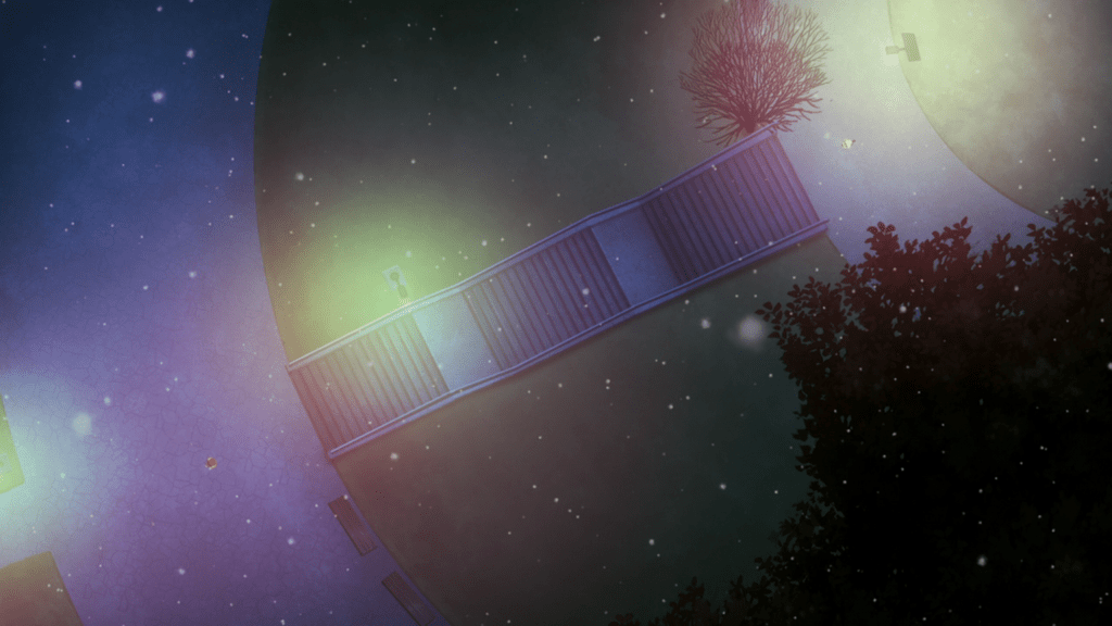 The Guidebook for Fun Day-Off Program Created by Takina Inoue ushers the girls around Tokyo according to a strict timetable. First, there’s some clothes shopping, followed by a stop at the arcade for some video games and a duel with a crane machine. Next, more shopping, this time for accessories, and then time to refuel via the consumption of vast quantities of pancake, setting them up for a visit to the aquarium—which is closed. Err… Takina quivers on the verge of panic when… Chisato to the rescue! They go fishing in the park instead until it’s time to make the trek to the final destination on the day’s program, well outside the city atop an escarpment where a secret awaits at 9pm.