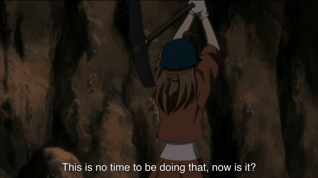 It happens when an enemy sets off a number of explosives to trigger cave-ins and crush the girls in the rubble. Iris disconnects from reality and retreats to a world where everything will be fine if only she continues to follow the advice she’s been given and do what her father said to do. As the ceiling collapses and the walls cave, Iris picks up her pickax and calmly continues tapping away at the rock. She does what her father instructed.