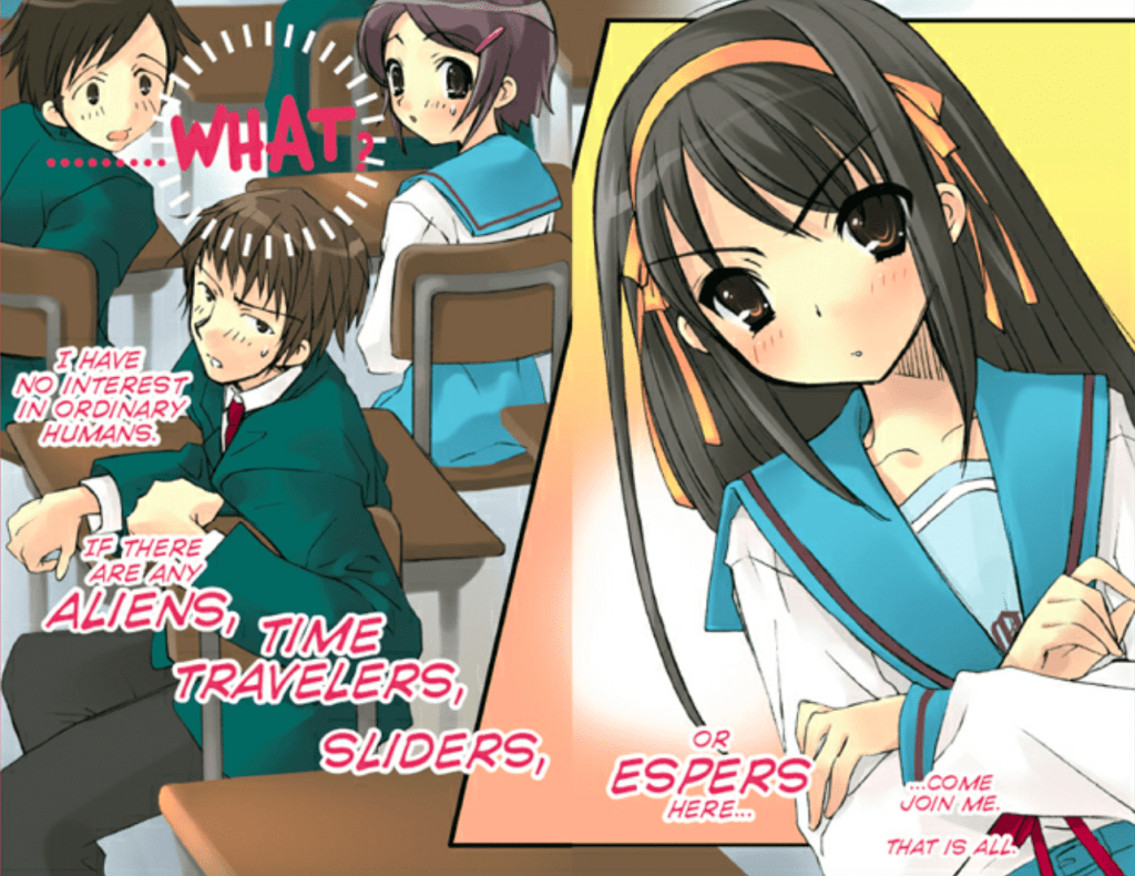 We’ll finish off the discussion next week when we ask meaty questions like, Why is Haruhi rebelling, and dig into the fun stuff too, like comparing the franchise to Evangelion! See you then!