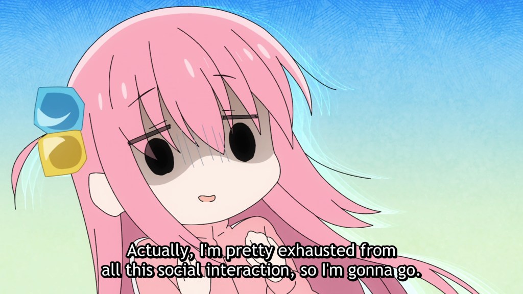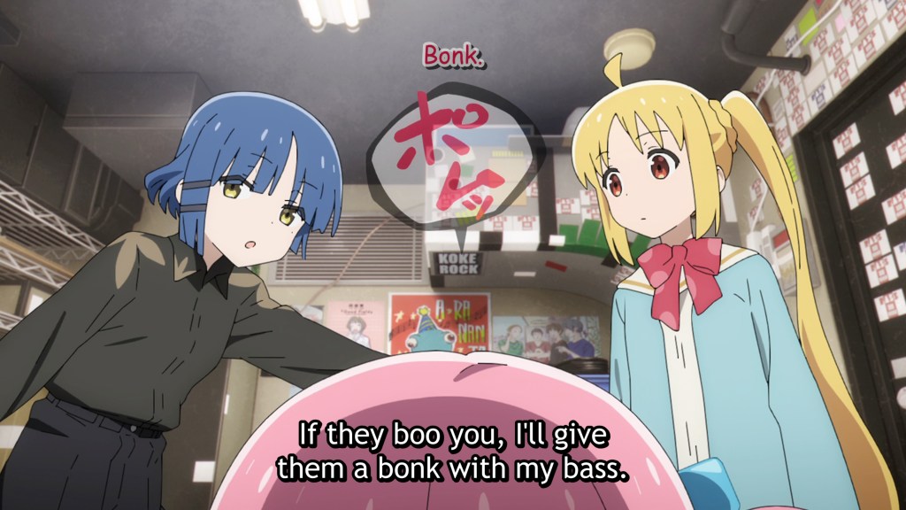 As an introvert who spent her first two significant pay cheques on acquiring a Gibson that was subsequently played in solitude, I have only one thing to say: I Approve. This episode does a brilliant job of inhabiting the introvert vibe. From Hitori’s self-talk, to the reactions of others around her; from the endearing support of her family who don’t want to push but do want to support, to her own inner battle to get herself to take that all-important first step out into the unknown (literally out of her bedroom closet, where she’s recorded her songs all these years)—this episode is on point. Yes, it’s uncomfortable at times to see her discomfort, but only briefly, because Hitori herself is so self-aware and has such a robust sense of humor that she is able to defuse her own distress. She’s a functional introvert who is ready to grow and start making social connections, and we get to see her taking charge and doing so. It’s not circumstances or other people who are pressuring or blackmailing her (as in another beloved introvert series, Hitoribocchi). Nope, our girl Bocchi the Rock has agency! On top of that uplifting quality, the animation is lively and fun, switching styles with ease to express the full range of melodrama Hitori is experiencing. The tone is also very playful with, for instance, fake credits rolling part way through when Hitori is melting into a puddle of overwhelmedness and decides to quit. The writing is tight, well-paced, and spirited, not to mention abounding in puns that translate quite well! We don’t have much of a sense of the other band members yet, since the episode concentrates on Hitori’s perspective, but with such good writing and solid voice acting, I’m sure they’ll each shine in due time. Now the question is, are we ever going to get some insert songs? I will definitely be sticking around to find out.