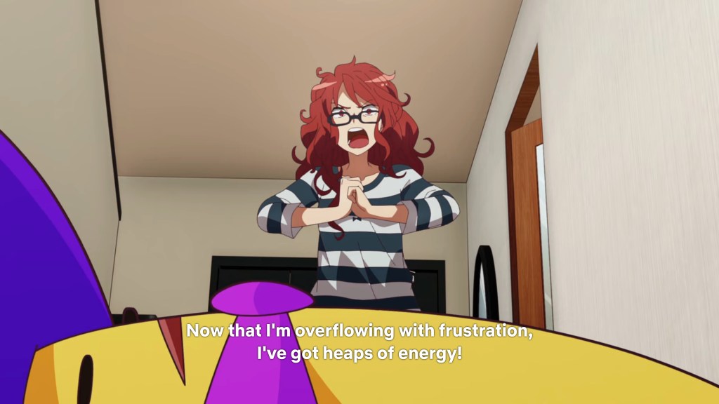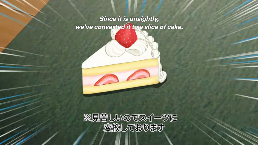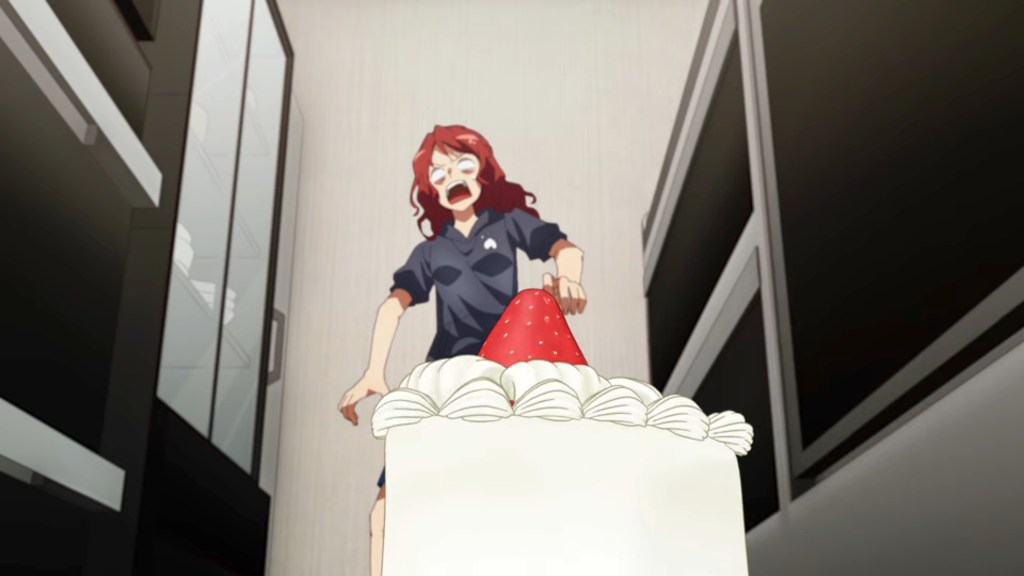 We have comedy gold here folks! The Fall 2022 season has been particularly good on the comedic front, and this penultimate premiere (one more tomorrow — stay tuned!) is sticking that landing. The physicality of the humor is on point: so much slapstick, but cranked to eleven thanks to the vivid, lively animation and exaggerated camera angles—the kind of thing that is usually reserved for dramatic fight sequences but also works so well for a character prone to comedic over-reaction, as is our Anzu. There is also a clever use of visual metaphors to heighten the humor, such as when the pixelated roach is replaced with an animated slice of strawberry shortcake to mask its repulsive appearance (which had remained decipherable in pixelated form), leading to some fantastic shots of Anzu recoiling in terror from a Japanese Christmas treat! The art is vibrant and loose, and the dialogue rapid-fire, but not so fast that it makes reading subtitles a drag. In fact, there’s even a self-aware joke early on about the necessity of avoiding overly long, complex texts when establishing the worldbuilding for a game/series. I see what you did there, author! Since this is a Netflix release, the whole season is now available, and it’s going to take all my willpower not to just keep going to the end! Incidentally, probably the best joke of all in this funny opener references the Netflix-induced binge-watching phenomenon in the introduction to the ED, which basically tells viewers to click on ‘watch credits’ rather than skipping on straight away to the next episode—precisely when the count down is going to, ahem, skip the ED. Talk about knowing your audience! Well played.