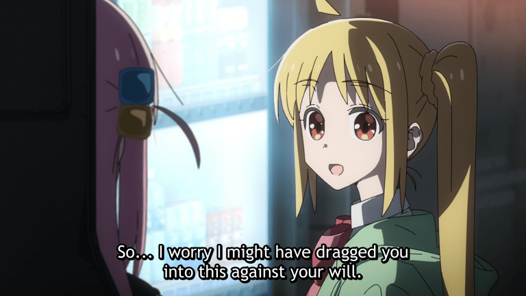 Nijika Ijichi, the leader of Kessoku Band, is a great example of this. helps us realize these things. Halfway through the episode, Nijika notices that something’s not quite right with Hitori. Simply put, she’s not all there, quite literally lingering almost outside of the frame under Nijika’s gaze. So Nijika catches Hitori while she’s making her way home down the lonely, dim streets. Truth be told, she’s a little concerned that maybe Hitori doesn’t actually want to be a part of the band—that she dragged Hitori in without asking first. And it shows. The entire interaction is a little forced, and Nijika is a little more pushy than usual.