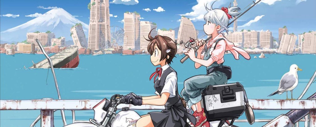 It’s the weekend and Youko and Airi are off on their Yamaha Serow for an adventure in Shuumatsu Touring! They are traveling the coastal route to Tokyo, hitting all the famous tourist spots along the way. Or at least trying to? If you squint, maybe you can see the resemblance between the glossy promo pics and what lies before them now, about fifteen years or so after something happened to wipe out the population, irradiate the land, and turn Japan back over to the mercy of its native flora and fauna. You see, shuumatsu, or “weekend” in Japanese, is also a homonym for “the end of the world”, and this motorcycle tour is happening after the apocalypse. But you probably got that from the English title, which sadly can’t replicate the wordplay.