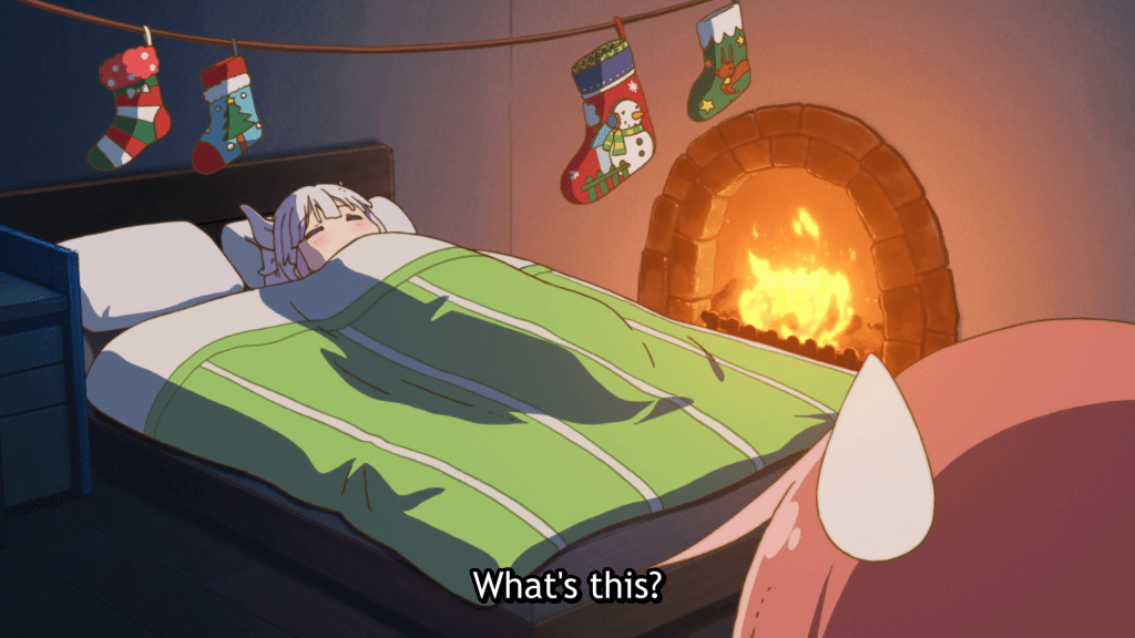 Tohru, the titular dragon maid, thinks for a moment and comes up with a plan: If there’s no chimney at their apartment, then they’ll just have to make one! So Kobayashi returns home to find the most cozy (if also the most hazardous) Christmas setup in all of Japan: stockings, brick fireplace, and flickering flames included. Kanna is ready for Christmas!