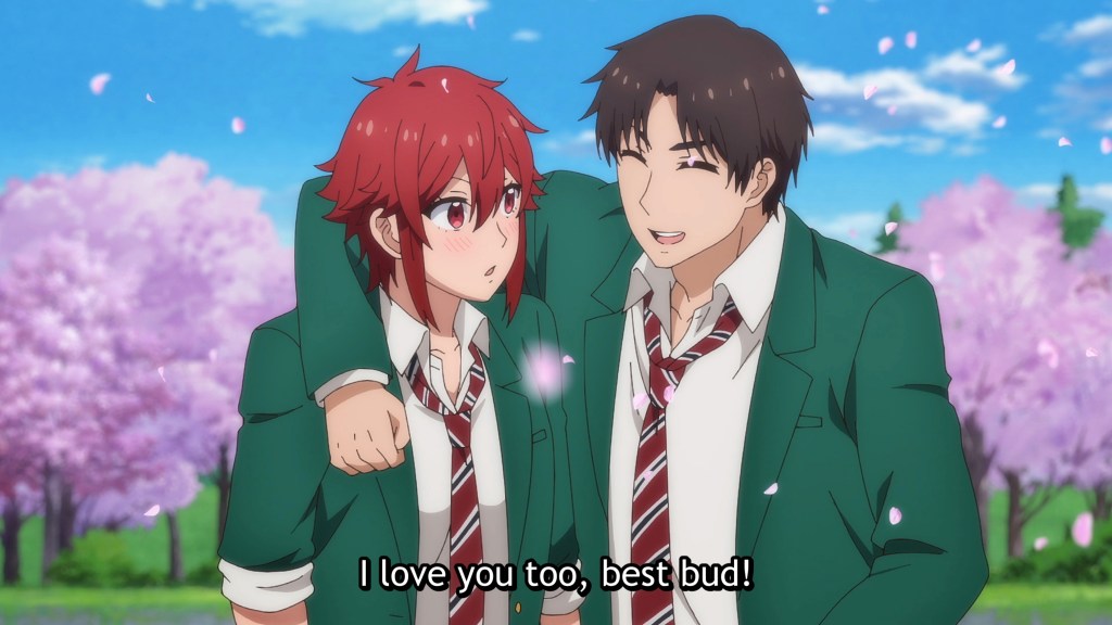 Tomo-chan is a girl who wastes no time. It’s her first year of high school and the cherry trees are still in full bloom when she confesses her love to Jun! Only, as it turns out, Tomo-chan has done nothing but waste time, as she’s been in love with her best friend for time immemorial. For his part, he still doesn’t see her as a girl. Just how much he doesn’t see her as a girl is up for debate during the first half of the episode, as the two’s comedic dialogue and slapstick interactions fail to clarify whether or not he realizes that she is, biologically speaking, female. It takes a hostile intervention from a third party, childhood friend Misuzu (who gives off strong evil genius vibes), to get Jun to acknowledge that he knows Tomo is a girl, but he remains committed to treating her like one of the guys, even if it does get him punched in the head every time he touches her in a “sports bros” kind of way. Meanwhile, there are a few other guys on the scene who are very aware of Tomo’s gender (she has a good, ahem, build), like the excitable Tanabe and cool pretty boy senpai Misaki, captain of the boys’ karate club to which Tomo belongs at school (she was too powerful for the girls’ club; they are now petrified of her). But Tomo has eyes only for Jun. How can she make him see her as potential girlfriend material, without compromising who she is? Let the hilarious antics and comedy of errors ensue!