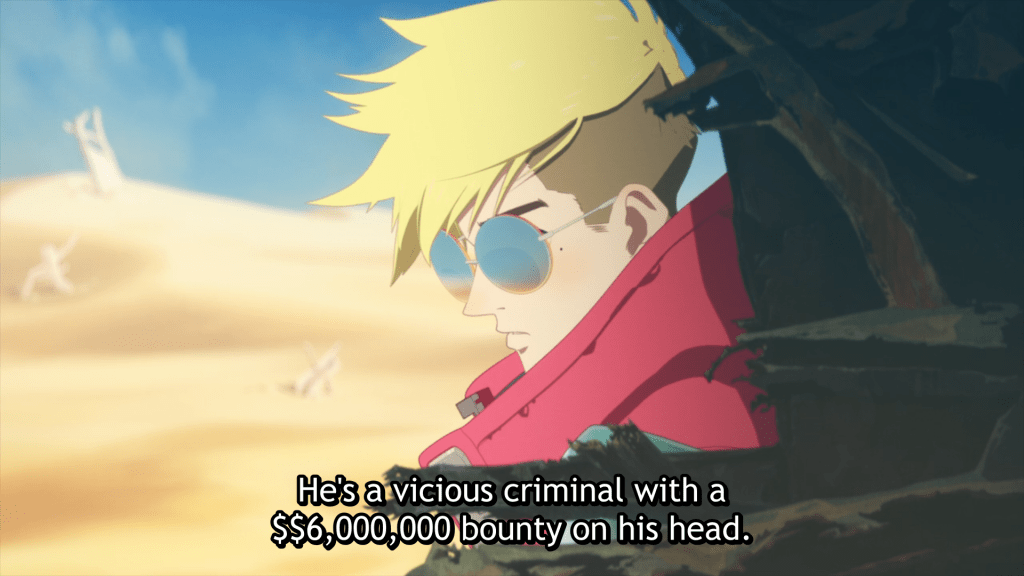 Vash the Stampede, a man with a $$6,000,000 bounty on his head, is found hanging upside down from a rope (but still alive) by Meryl Stryfe, who is on the hunt for an interview with him. She’s with veteran reporter, Roberto, who believes Vash to be a monster who has taken many lives, but Meryl is skeptical and won’t turn Vash over to the police just yet. Vash, Meryl, and Roberto arrive at Jeneora Rock where the locals are in need of clean water. Vash has helped these folks in the past so they are glad to see him alive. He offers to help them again, and see what he can do about the plant that produces the precious H2O. When they arrive at the plant, Vash notes that it needs to be replaced, but it would cost a large amount of coin to swap it for a new one. The situation gets complicated when the military police arrive, but instead of being taken into custody, Vash and their captain end up in a deadly duel that endangers the entire town. Thankfully with enough luck and skill, the blonde vigilante saves the day and continues his search for his brother, Knives, who is seen at the end.