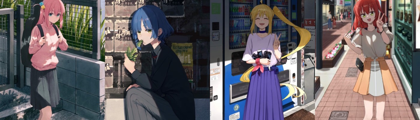 Kessoku goes casual? Check out these lovely illustrations of Bocchi, Ryou, Nijika, and Kita out and about. They subtly (and in Ryou’s case, not-so-subtly) capture the girls’ personalities. Who’s your favorite band member?