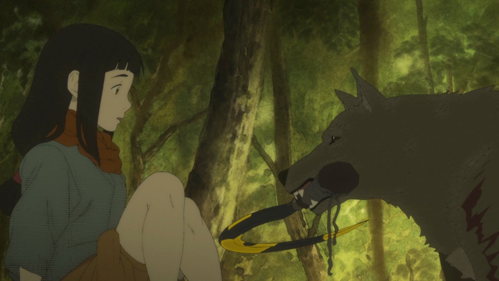 A man armed with a sickle battles to overcome a vicious beast in the forest, saving the life of a little girl at the cost of his own. With his dying breath, he tells her the name of his dog, Kanata, who has fought just as fearsomely as his master. This is no simple, if profound, act of sacrificial courage, however. This rescue comes at a great price for the little girl, Touko, who must now undertake the perilous journey through the forest to the city from whence her hero came, to return his sickle and dog to his people. Why must she do this? Because this man was no mere woodsman or traveler. He was a Fire Hunter, whose sacred duty it was to track down and capture liquid lightning, the energy source that powers this post-apocalyptic world. Generations ago, human physiology changed—in such a way that approaching fire would cause a person to spontaneously combust from the inside out. (This seems to include electricity as well, meaning that, in effect, electronic devices decimated the world. Interesting…) Since that fateful moment of mutation, the world has become an exceedingly dangerous place, which is why young Touko’s commission to visit the city is in effect a death sentence, and everyone knows it: her auntie, her hateful cousin Rin, her grandmother, and the men who operate the armored vehicle she will travel on for the next five months. Meanwhile, in the city…