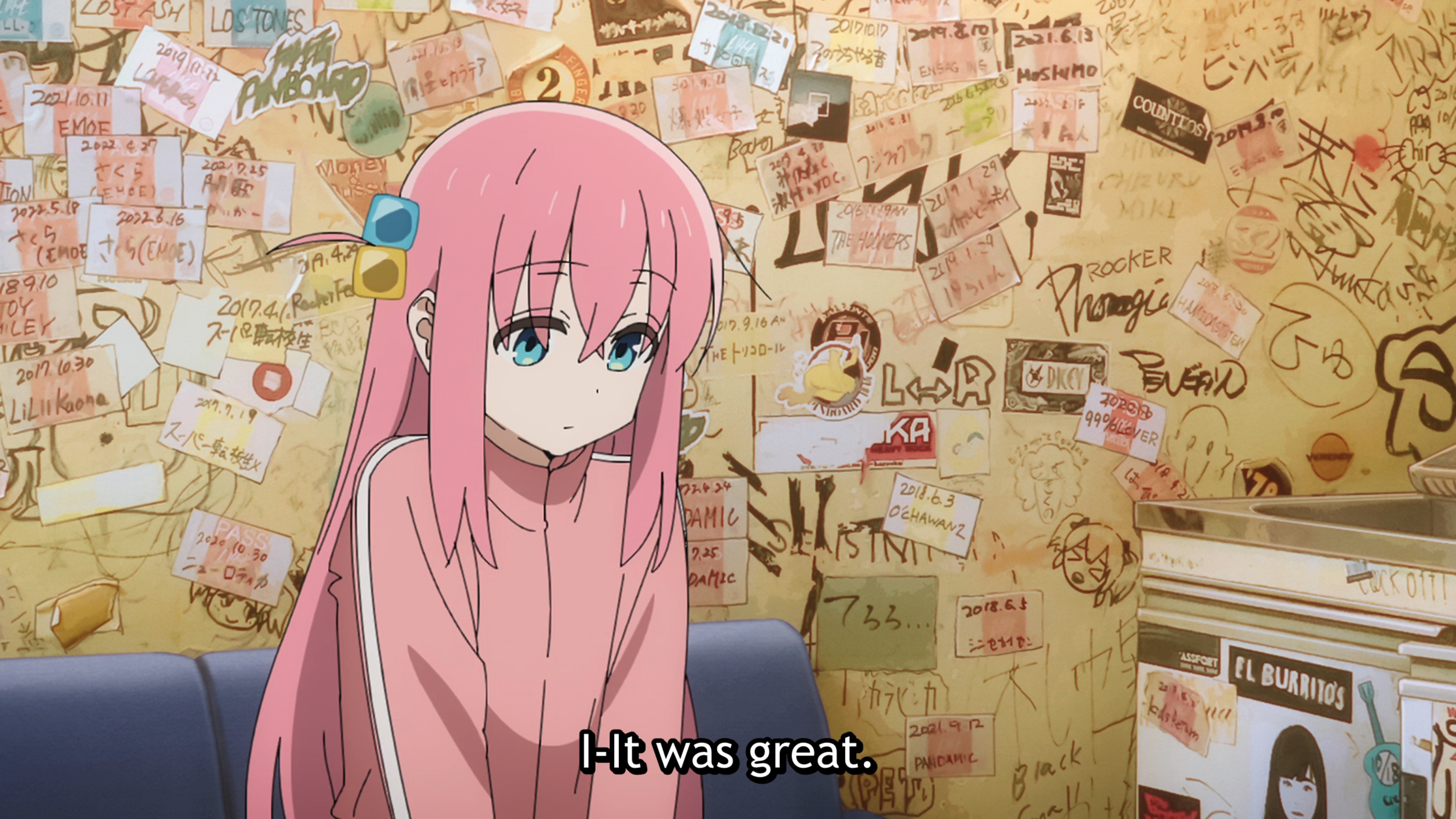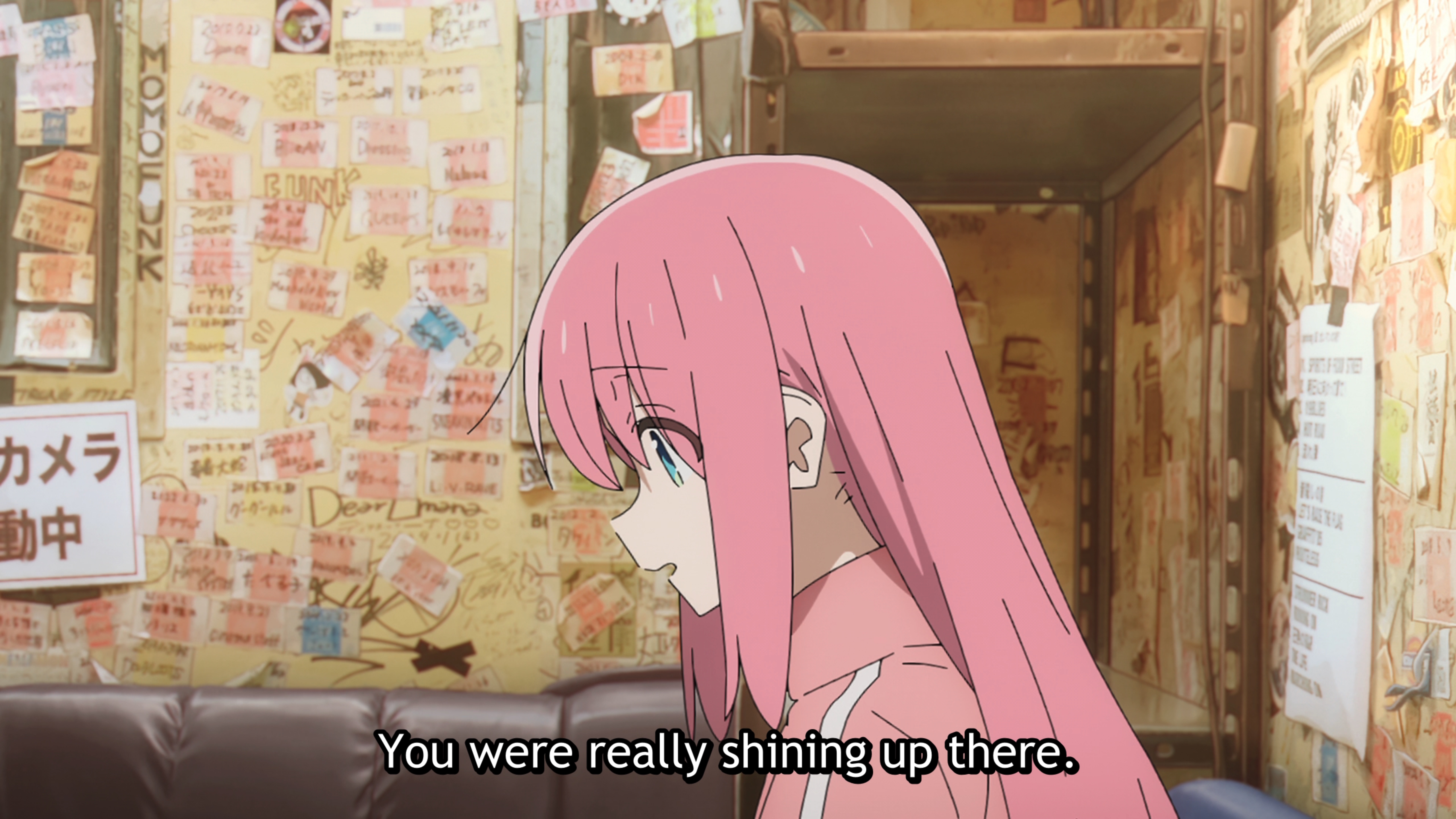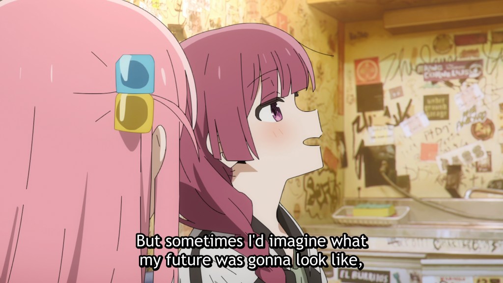 Up to this point, Hitori seems to be getting closer to her dreams of heroism. She’s gone from uploading covers in the darkness of her cramped closet to playing live before an audience. She even has some fans! And she’s already Nijika’s hero for her role in reviving Kessoku Band and bringing Nijika’s dreams a little closer to becoming a reality. The hero’s journey is afoot, and it’s only a matter of time before the social anxiety dragon is slain, the princess of rock stardom is saved, and Hitori basks in the fame and musical glory that she’s earned.