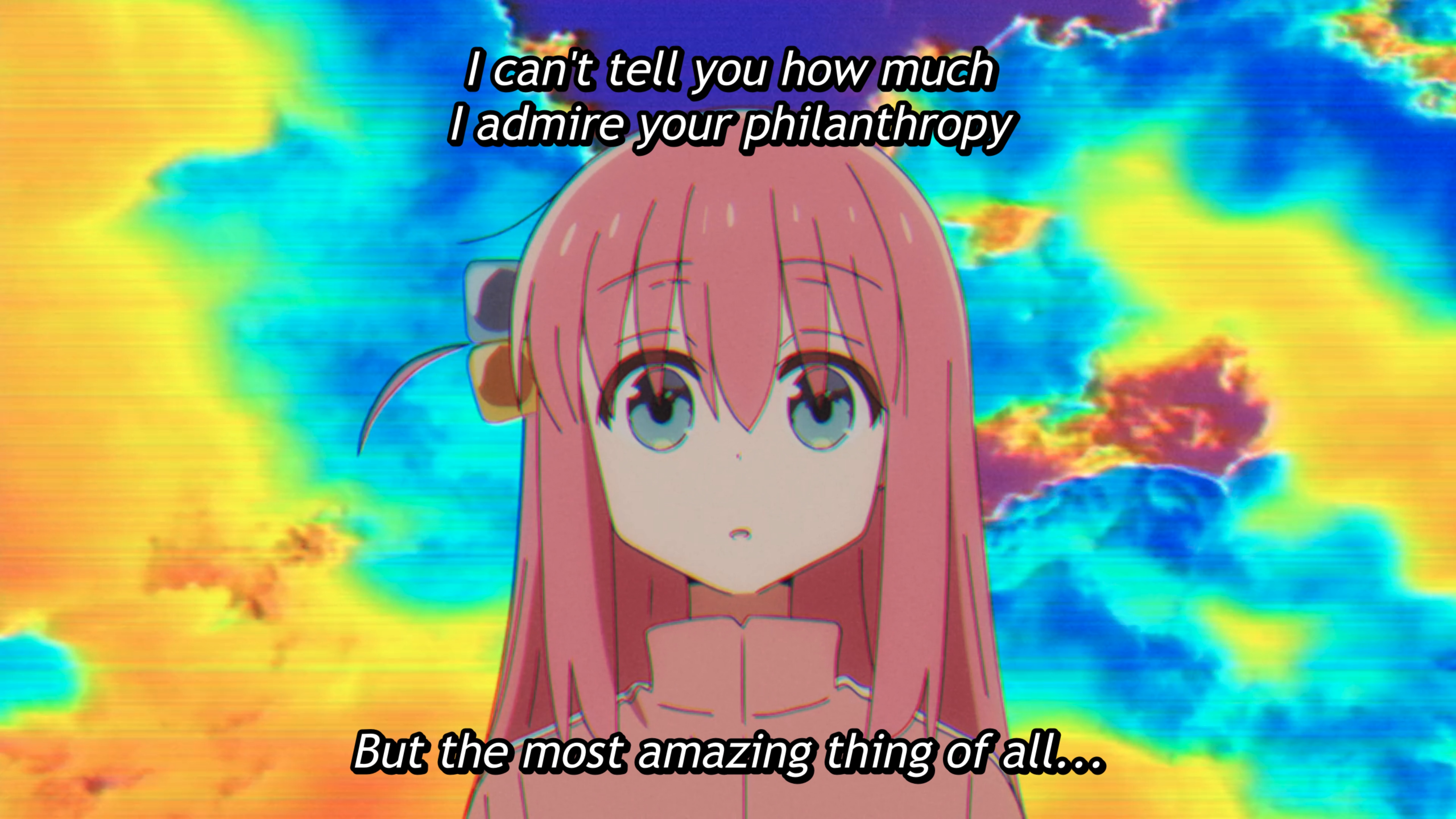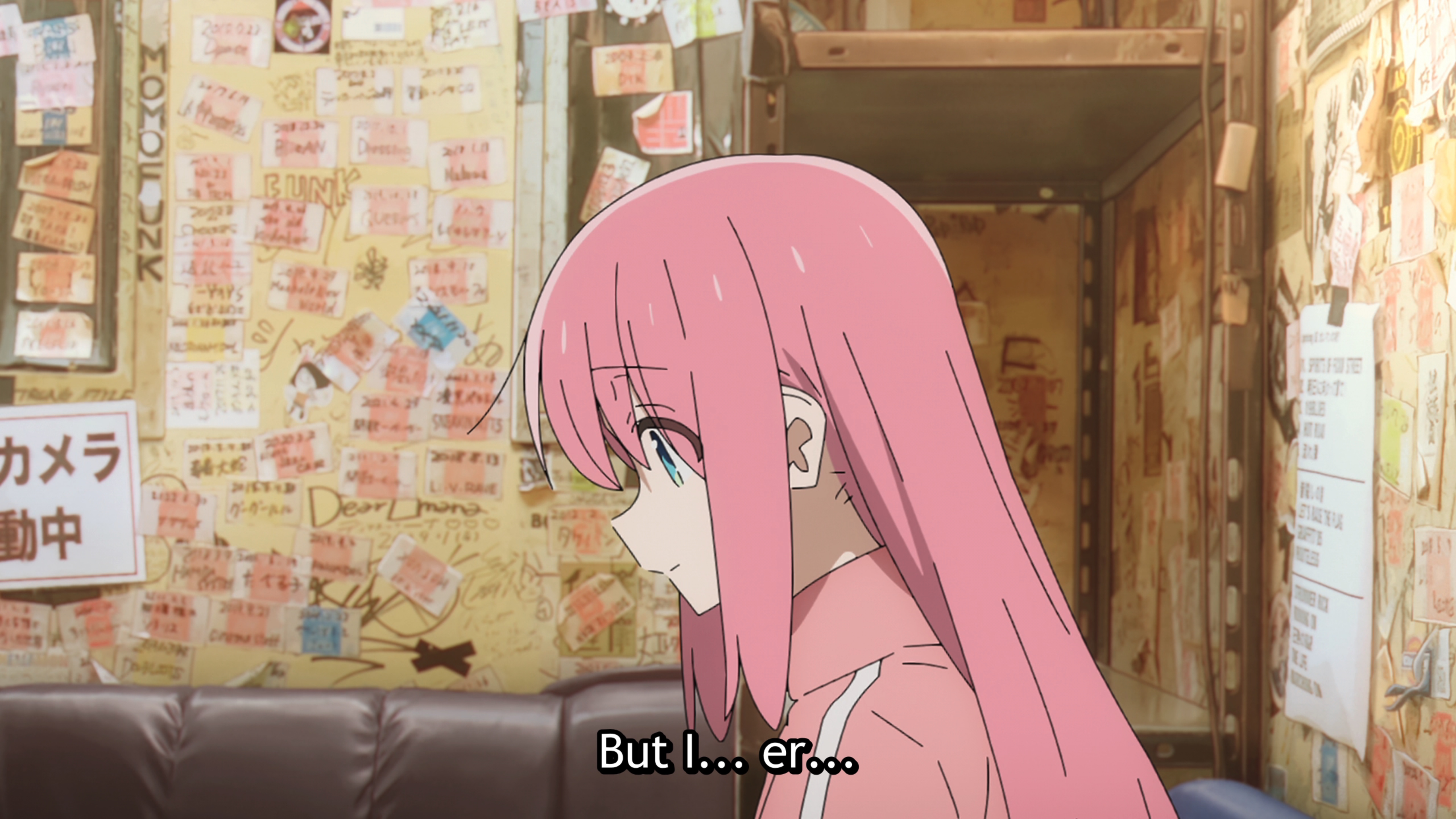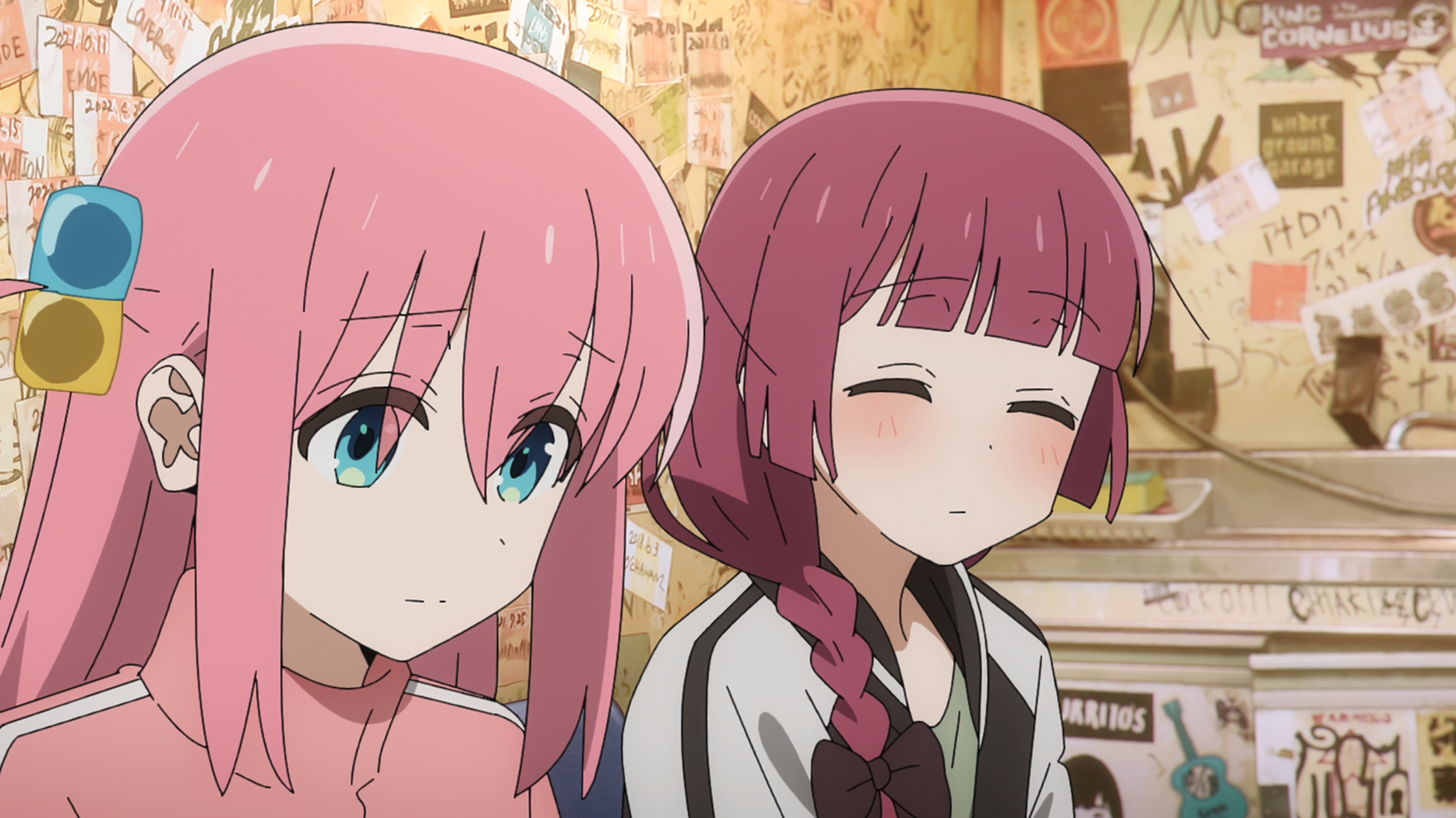 Up to this point, Hitori seems to be getting closer to her dreams of heroism. She’s gone from uploading covers in the darkness of her cramped closet to playing live before an audience. She even has some fans! And she’s already Nijika’s hero for her role in reviving Kessoku Band and bringing Nijika’s dreams a little closer to becoming a reality. The hero’s journey is afoot, and it’s only a matter of time before the social anxiety dragon is slain, the princess of rock stardom is saved, and Hitori basks in the fame and musical glory that she’s earned.