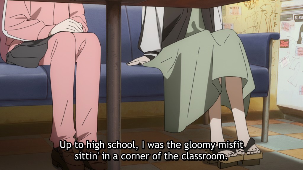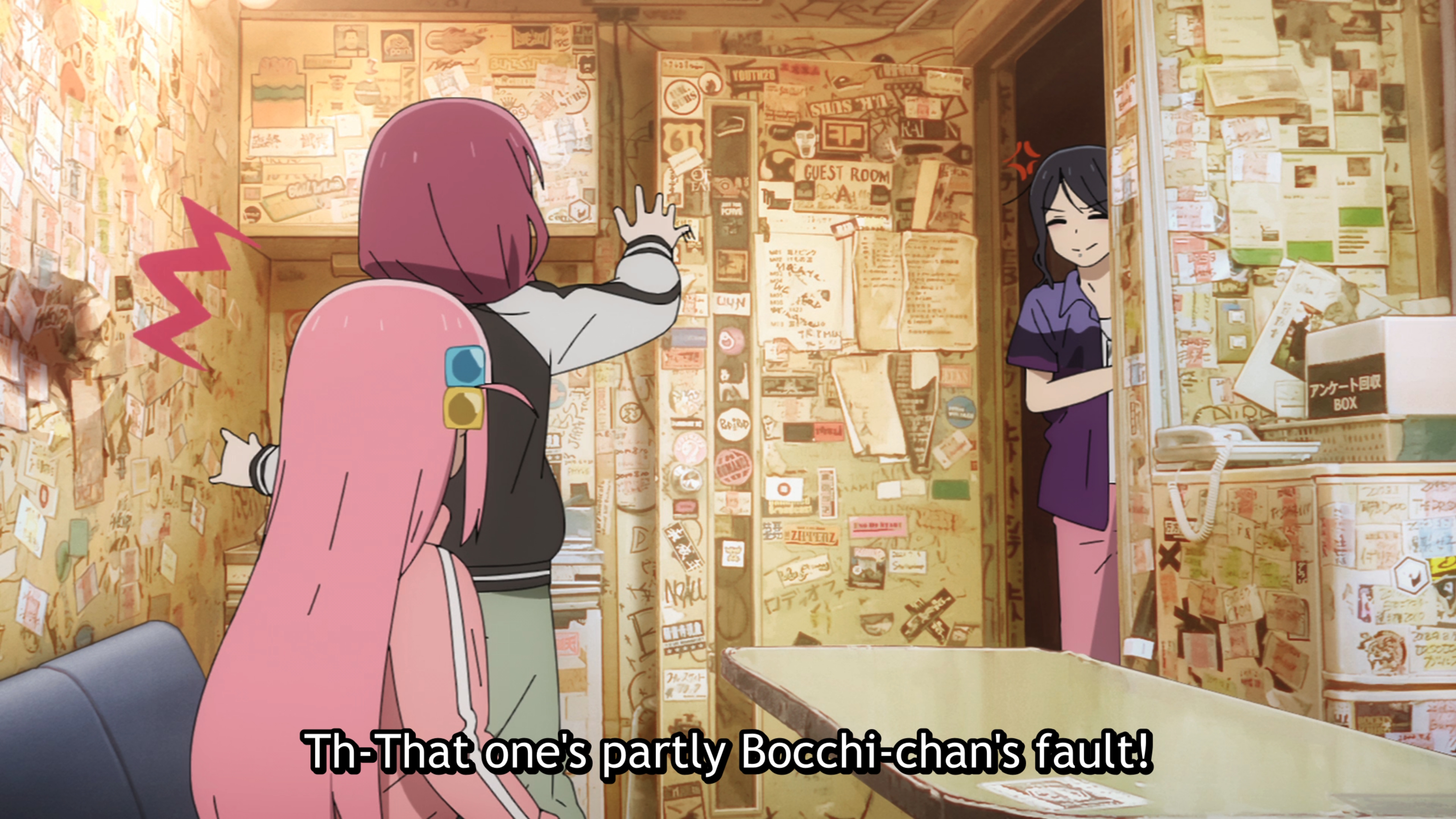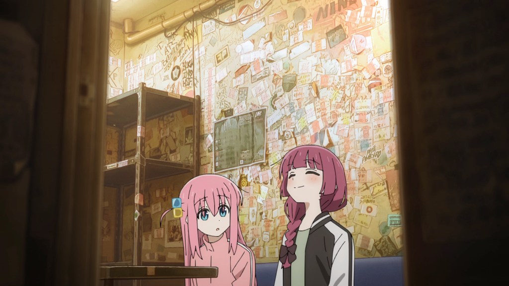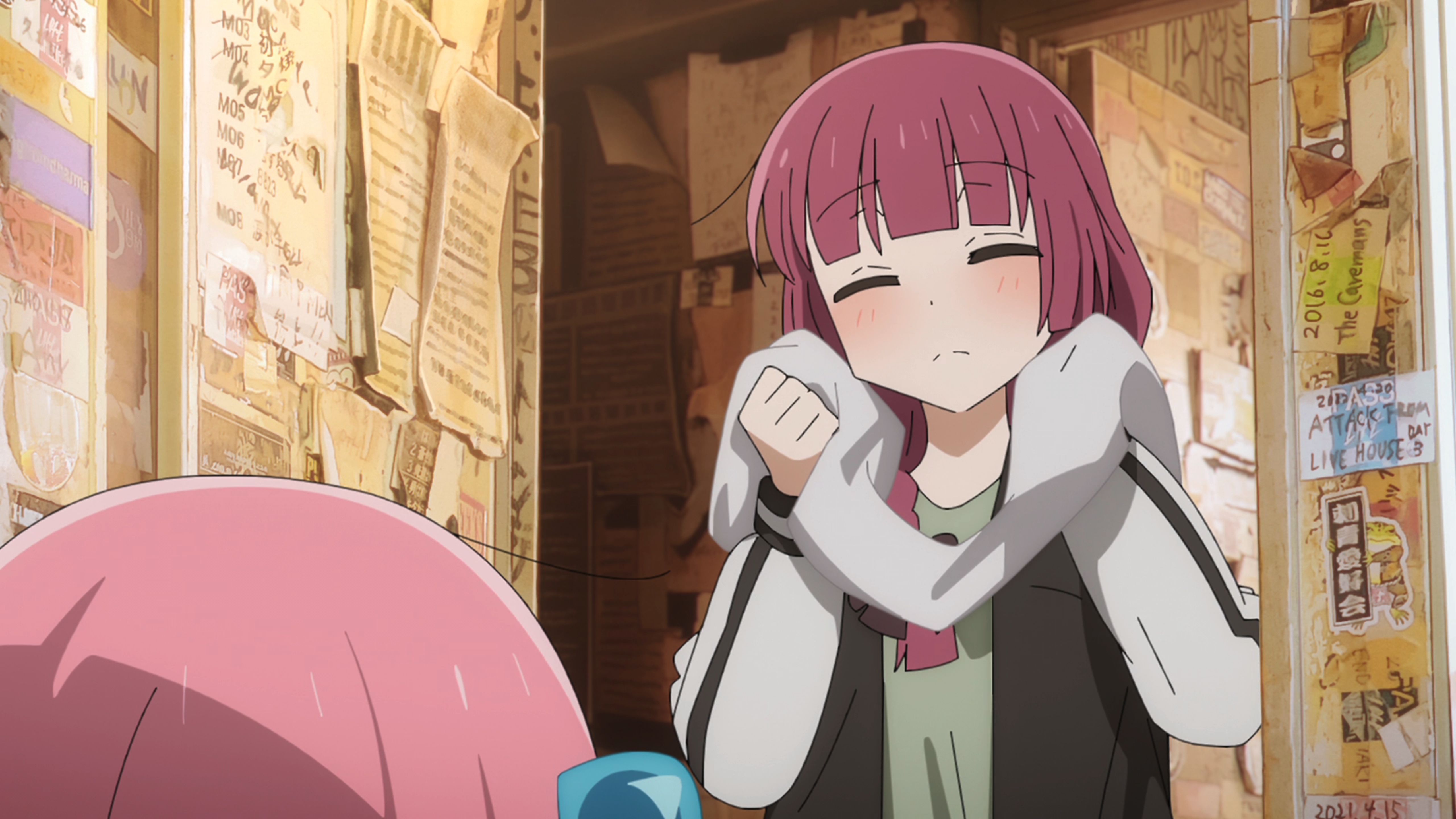 And to her credit, Bocchi admits her train of thought when Hiroi picks up on her mood and prods her about its source. And here’s when the surprise comes—that incredible, mind-blowing ten seconds—as Hiroi basically explains that what Bocchi has been thinking of as birthmarks—indelible and inescapable, the defining features of her very self—are just dirt. They can be washed away. Granted, Hiroi’s method of washing involves copious amounts of alcohol (close your eyes, kids!). But the point is, Hiroi does for Bocchi exactly what Eunice did for that toddler. She tells her kohai in no uncertain terms that all the things that seem destined to limit Bocchi, locking her away into a medium-sized mandarin box, are not actually the final word in the matter. And because Hiroi is speaking from experience, Bocchi recognizes that there is hope.
