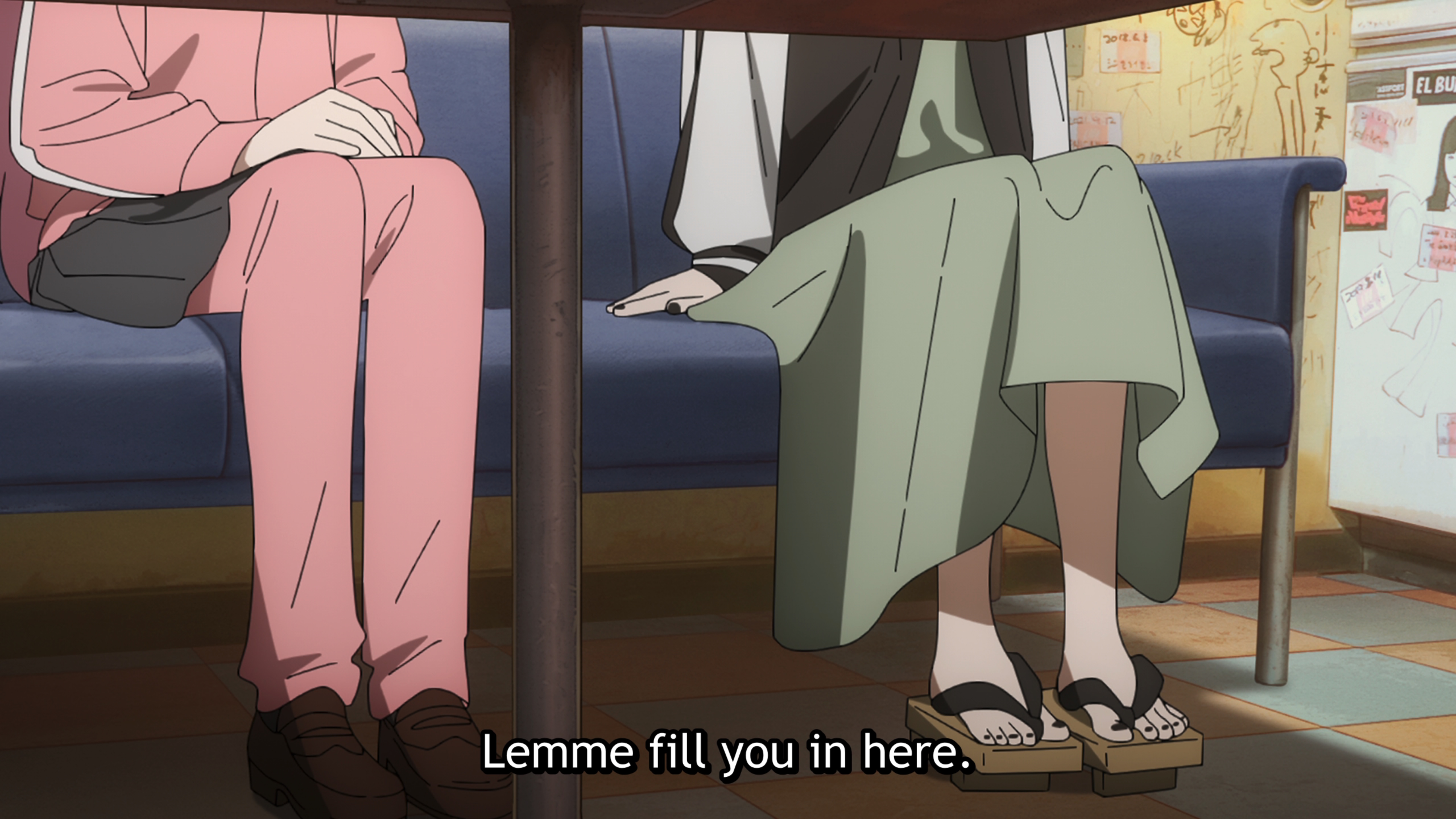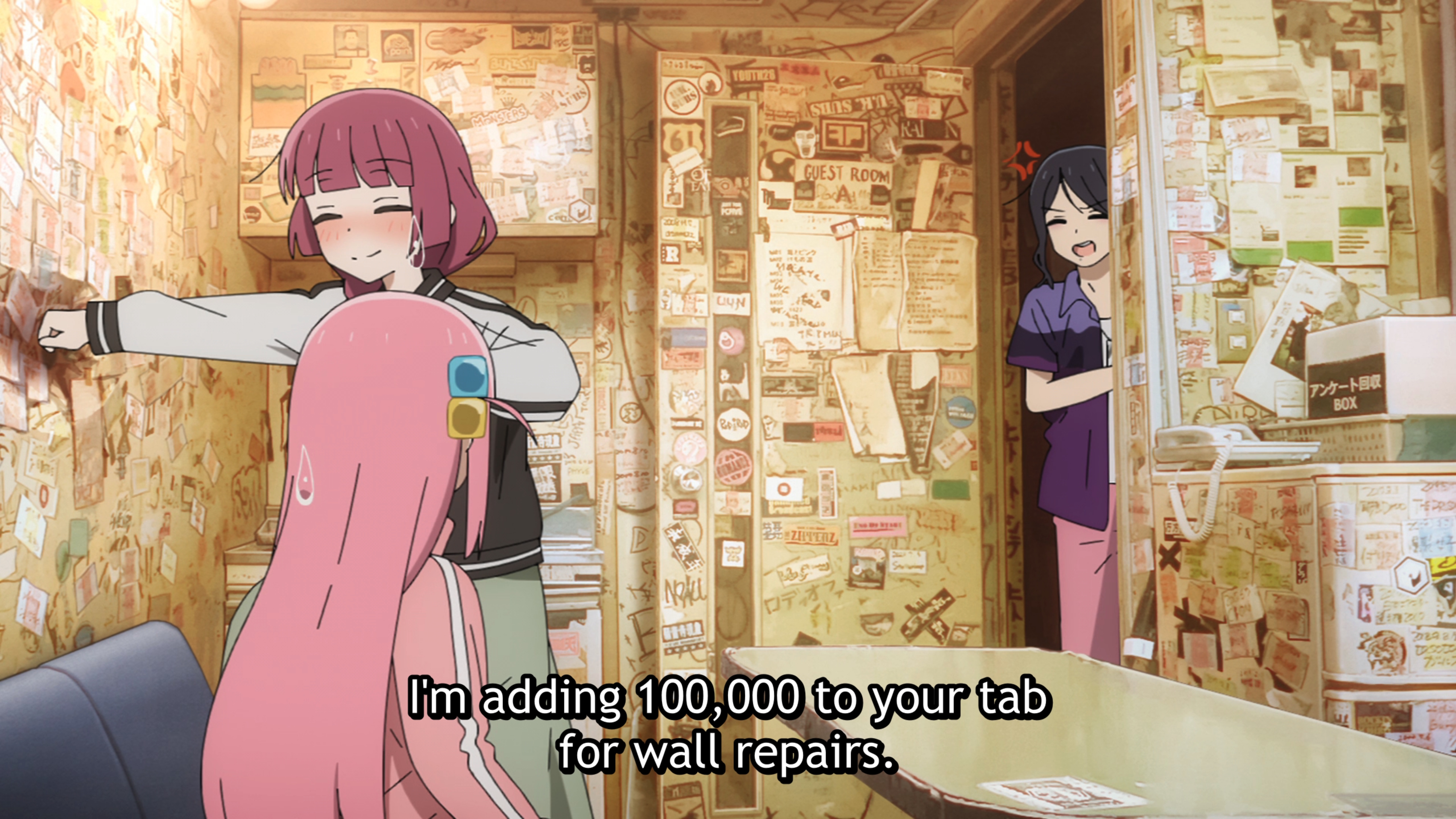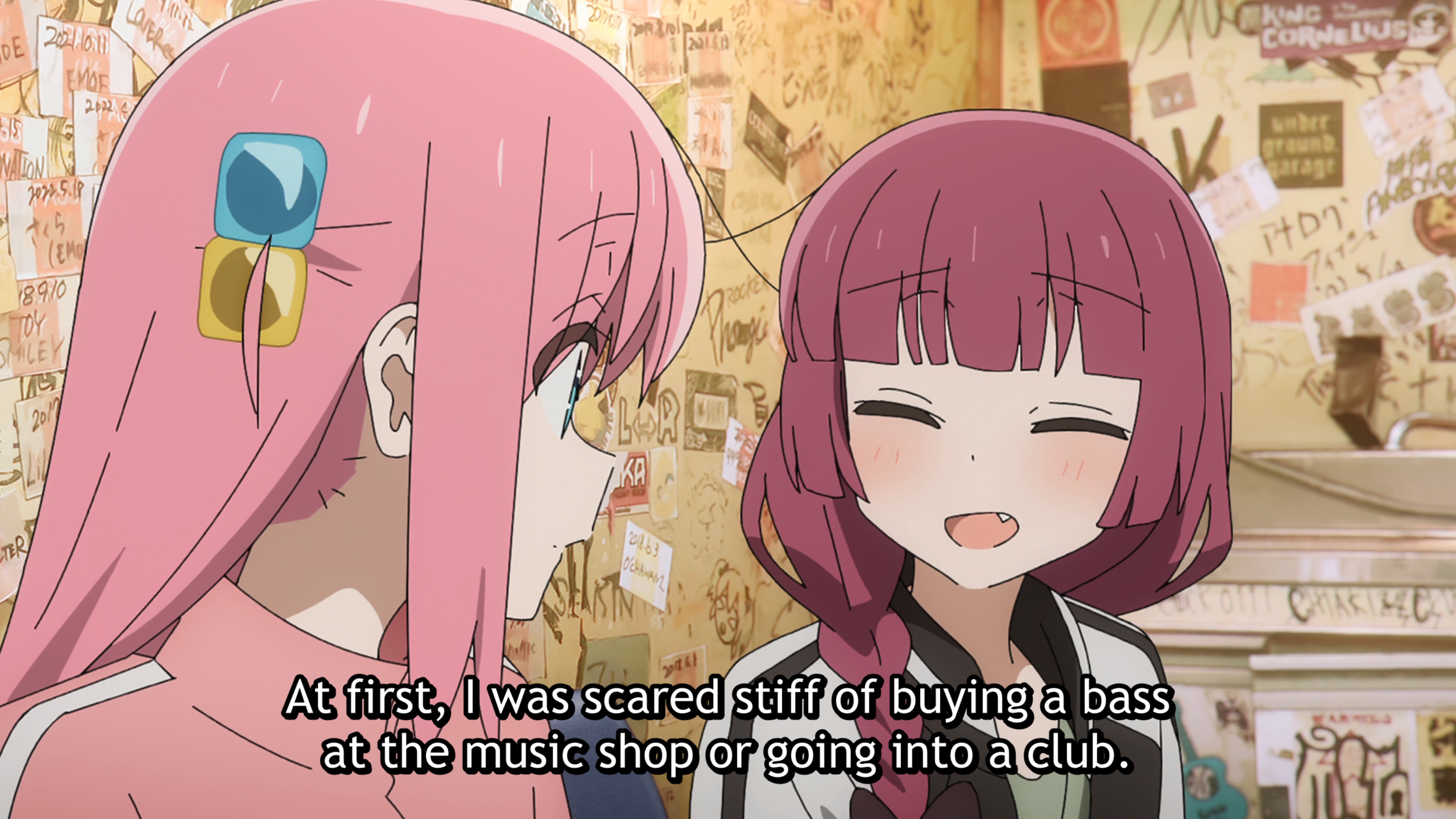 And to her credit, Bocchi admits her train of thought when Hiroi picks up on her mood and prods her about its source. And here’s when the surprise comes—that incredible, mind-blowing ten seconds—as Hiroi basically explains that what Bocchi has been thinking of as birthmarks—indelible and inescapable, the defining features of her very self—are just dirt. They can be washed away. Granted, Hiroi’s method of washing involves copious amounts of alcohol (close your eyes, kids!). But the point is, Hiroi does for Bocchi exactly what Eunice did for that toddler. She tells her kohai in no uncertain terms that all the things that seem destined to limit Bocchi, locking her away into a medium-sized mandarin box, are not actually the final word in the matter. And because Hiroi is speaking from experience, Bocchi recognizes that there is hope.