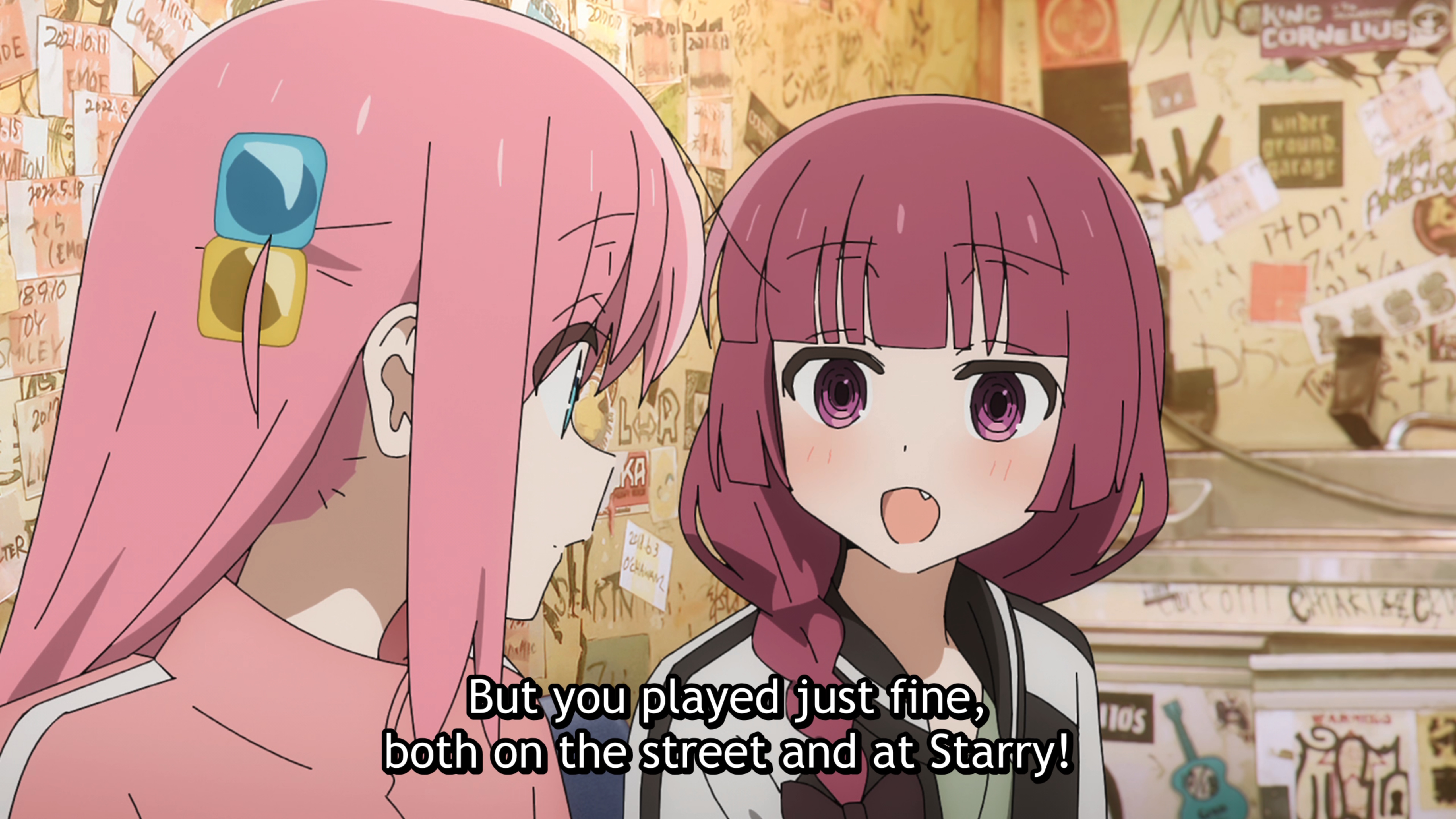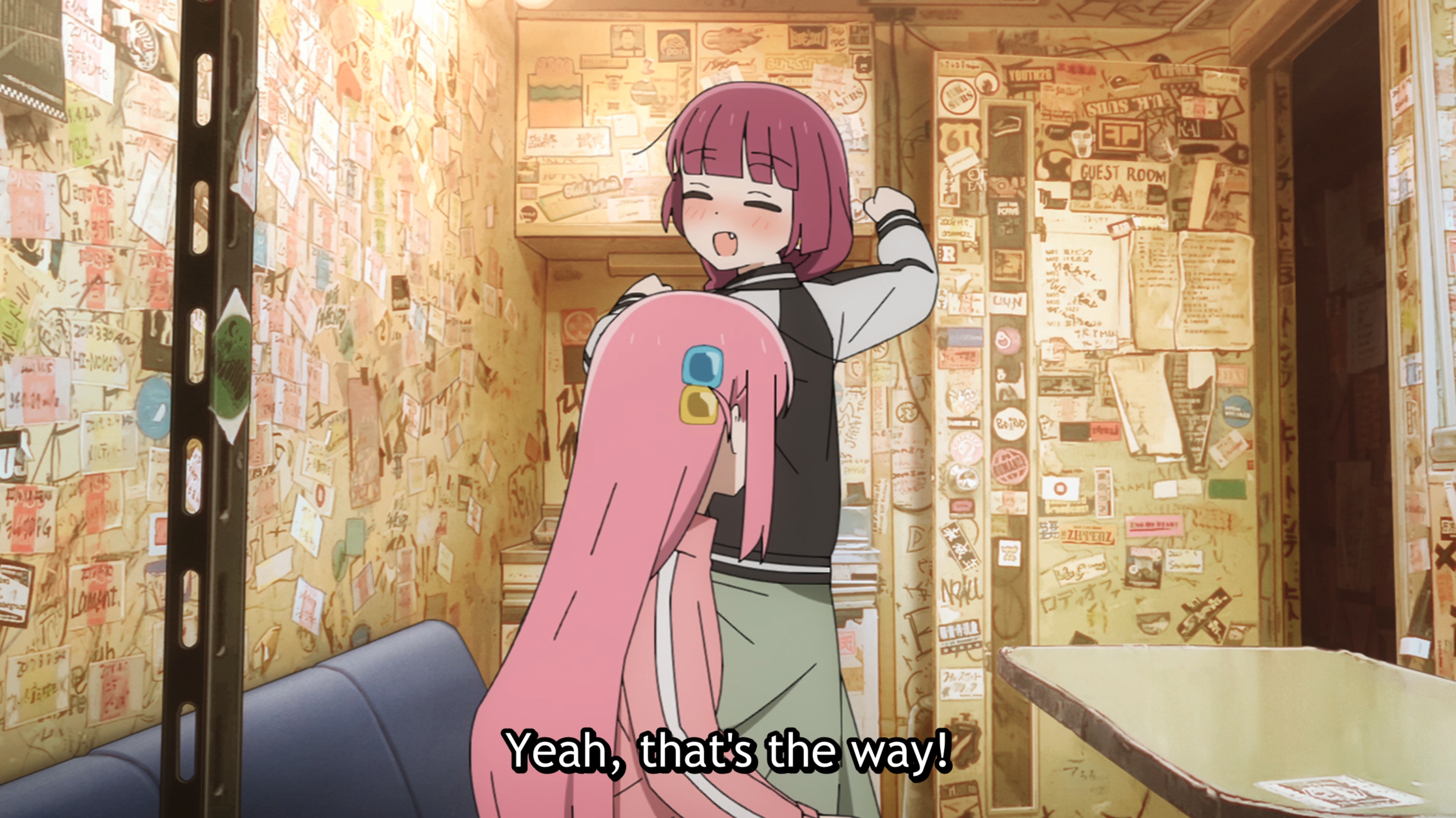 And that’s Hiroi’s message to the discouraged and defeated Hitori: don’t exaggerate what being a hero looks like. That’s what Hitori has been doing all this time: she’s been holding up this perfect picture of the perfectly charismatic musician who launches her career playing perfect chords in a perfectly packed stadium. Hitori wants to be the ideal hero up front, and this idealization forces her into the valley of disappointment and even jealousy, as she compares herself to the shining Hiroi and finds herself falling short.