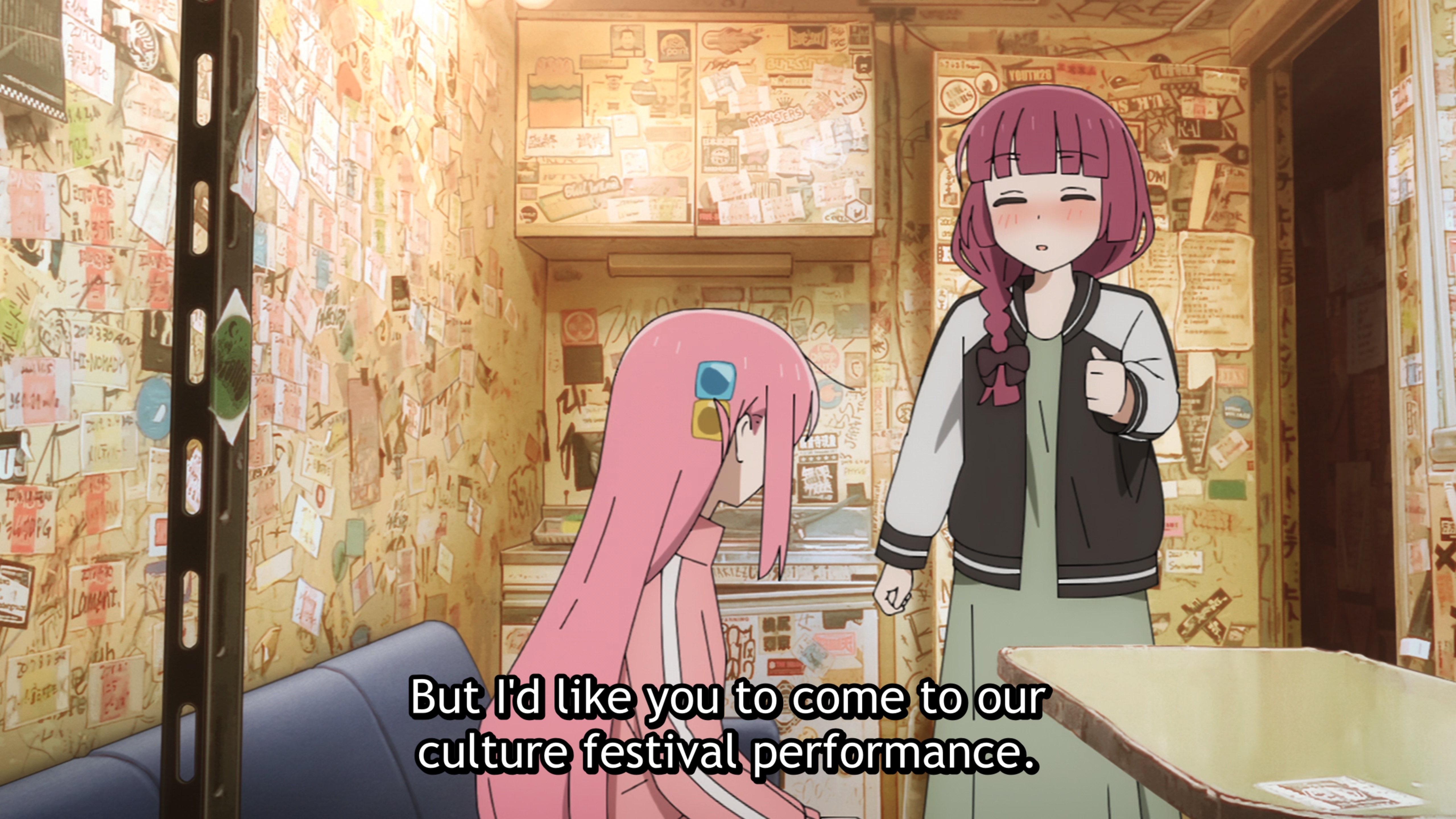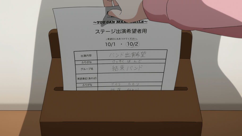 But soon enough, Hitori’s adventure meets a classic obstacle: the troll’s bridge. The school festival is on the horizon, and Hitori must make a choice. Should she sign Kessoku Band up, bravely cross the troll’s bridge, and hope that she’s able to pull off a dazzling performance when she’s only ever performed in front of, like, ten people before? Or should she take the cowardly route, toss the application form, and hope for more confidence in the future?