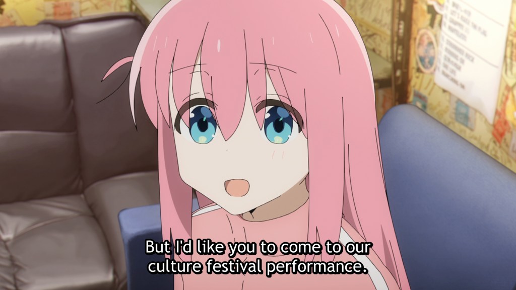 This is what I love about Bocchi: she’s learned to articulate her doubt rather than leaving it bottled up. And when she does this in her conversation with Hiroi, it’s like she’s extending an invitation to her senpai to speak into her life. She can only see the gloom of her birthmarks, but can Hiroi perhaps see something different? Yes! And here’s the key: Bocchi actually listens to what Hiroi has to say. She hears her. And in that moment of hearing, Bocchi discovers the will to let go of her inner narrative of disappointment and despair, and grab hold of hope instead. “I’d like you to come see our culture festival performance,” she says. What a beautiful testimony this simple line conveys of Bocchi’s changed heart!