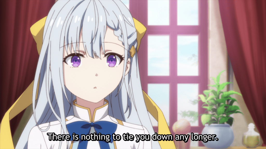 That generous love is revolutionary to Euphie, and in some sense, to the kingdom itself, embroiled in succession disputes, diplomatic conflicts, and noble-commoner divisions. Amidst all that, Anis shatters conventions with her joy and care for all and her progressive advocacy for “magicology,” a science that would allow commoners to use magic. In Euphie’s words, Anis will prove to be a “powerful medicine” for the kingdom if only the nobles can swallow her unceremonious methods. She’s already proven to be that for Euphie, whose brief moments of joy in the episode come while she’s testing the magic tool Anis made for her.