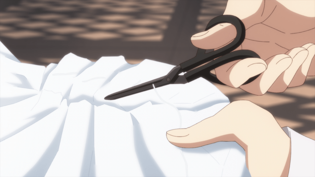 It’s not just Watari’s hand at work here, though; the direction also helps to clue us into Euphie’s conflict. Euphie excels at acting the part of the perfect queen, making it hard for her to admit her sorrow openly, and means that no one around her notices her subtle pleas for help. It’s a suffocating situation, portrayed by intimate composition and attention to detail with facial expressions. Episode three features a heartbreaking scene in which Euphie stumbles across her former maids adjusting her wedding dress for the new queen-to-be, where their discussion of her newfound “freedom” is immediately followed by a shot of them snipping the stitches of her dress—cutting her off from the happiness she had longed for.