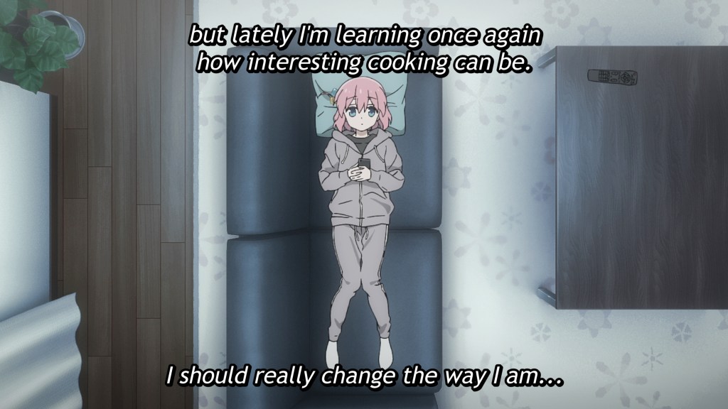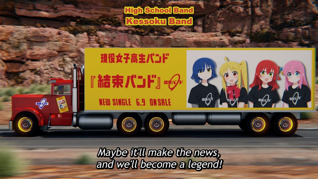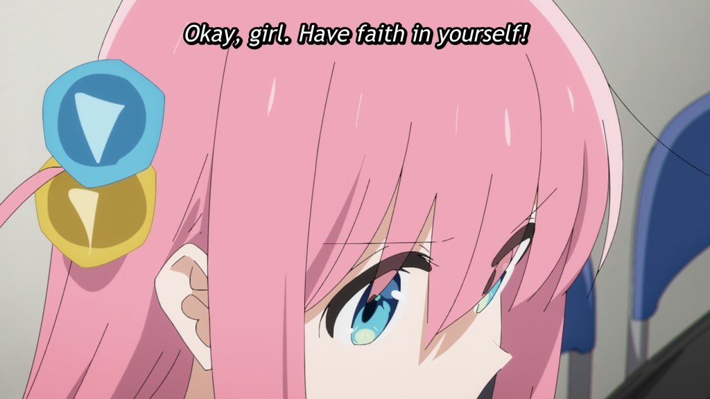 And she does! By the end of the series, Bocchi has learned to replace a lot of the negative things she used to dwell on about herself and the disasters that would surely befall her, with positive self-talk instead. She’s taken to heart the encouraging words that Nijika and Ryo and Kita have said about her, and she reminds herself to have faith in herself. She even indulges in a fantasy of wild, outrageous success for once! Bocchi grabs hold of the truths that her friends have spoken over her and displaces the lies of fear with them. She chooses to listen to a different narrative and to own it for herself.