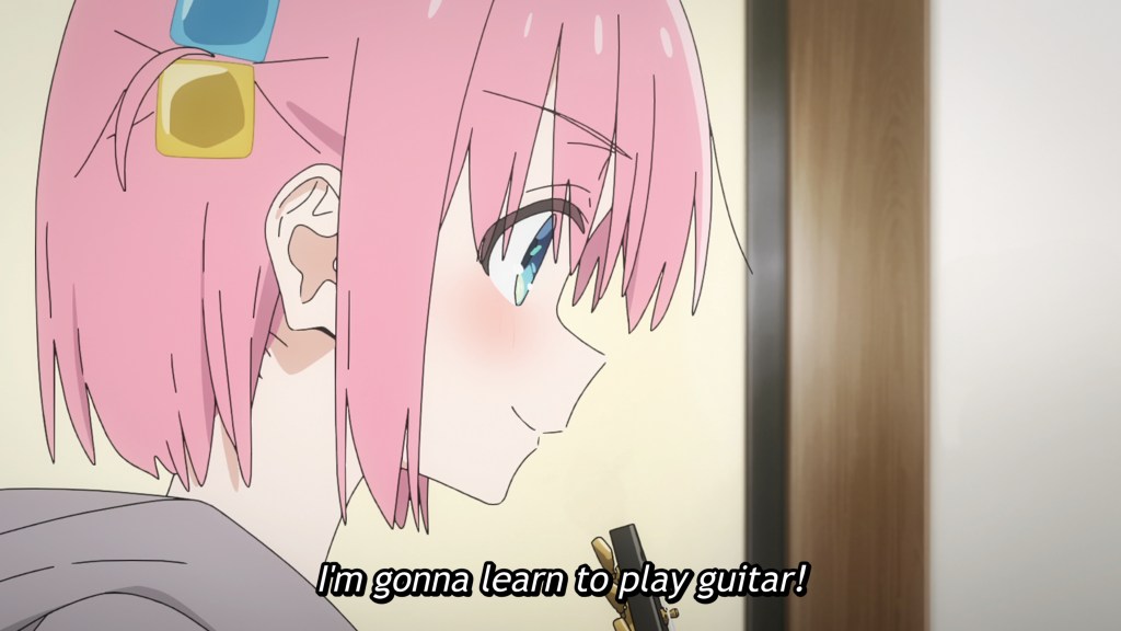 For Bocchi, that moment of vision—of seeing bright, colorful life amid the gray of her current existence—comes in the first year of middle school, when she sees a tv interview with a popular young musician. He was once like her, a shy loner, but music and joining a band gave him a whole new life. “A band is a place where even introverts can shine,” he explains. In a flash, Bocchi receives a vision of her life inverted, and it fires her up! She etches it on her heart and pursues it with reckless abandon. Later, when she hits another rough patch, her vision is renewed when her senpai Hiroi shares a similar story with her, reviving the dream and injecting Bocchi with a fresh sense of possibility and purpose.