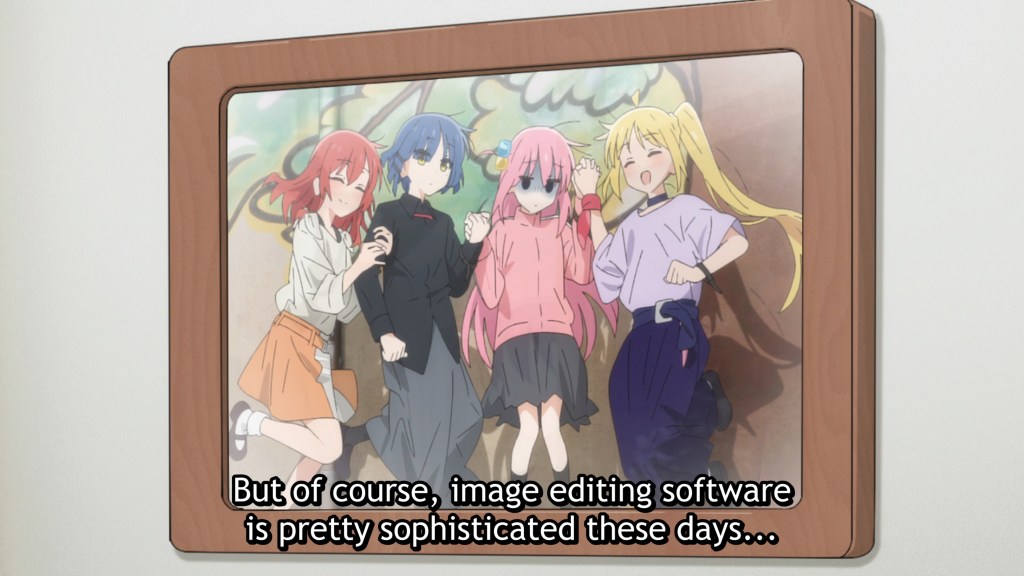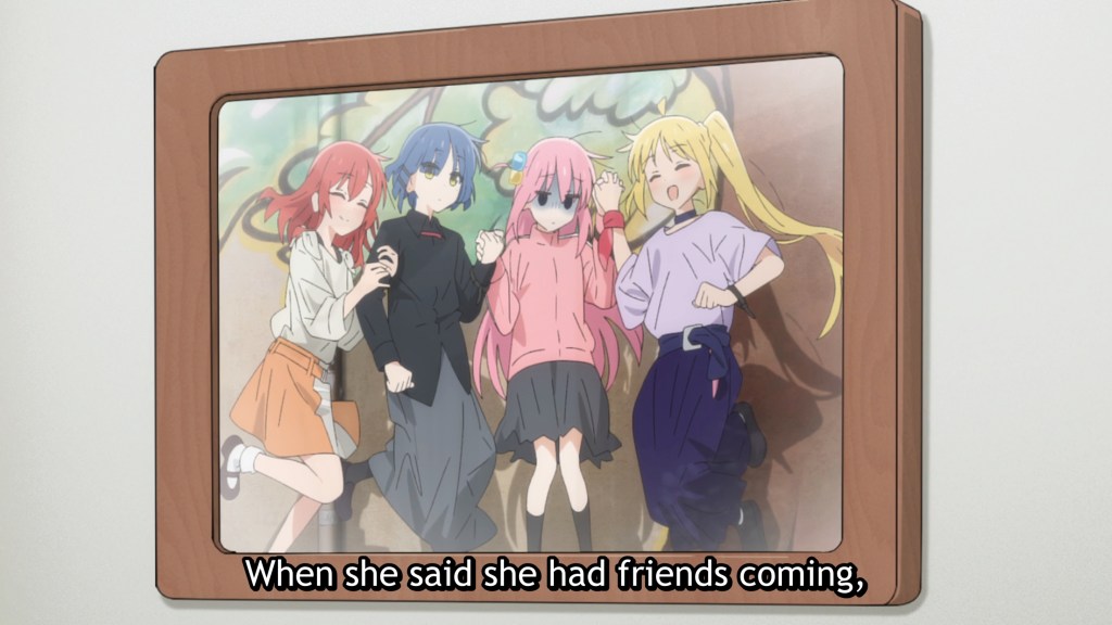 Here’s the thing though: we’re not going to get this part perfect. Bocchi certainly doesn’t! There will be days when we slip back into old patterns, and times when that small choice that was starting to come so much more easily suddenly becomes really difficult again. It happens to Bocchi after seeing her senpai Hiroi’s performance, and after filling out the form for the culture festival. She balks and wavers and melts into a puddle and turns into a Picasso painting and Edvard Munch’s The Scream and maybe even Nosferatu at one point. She struggles so much that it takes a virtual cornucopia of multimedia to fully express the depth and range of her battles with fear and anxiety along the way. So no, it won’t be perfect. And it won’t be easy. But it will still be possible, and that’s what Bocchi never loses sight of. And she is able to remember this because of a little help from her friends.
