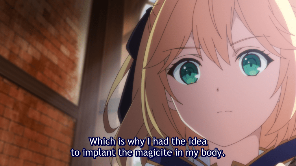 I mentioned before that Anis struggles with envy, and as we see in this episode, it’s led her to the bottle—the bottle of magic pills, that is. In her words, “magicite allows you to use a power that’s basically pseudo-magic.” Music to the ears of a muggle but not so to her body, which aches and groans under the weight she puts it under during the dragon fight. True, that does lead to some breathtaking fight sequences (with a fully animated dragon, I might add!). But these scenes are equally harrowing. Anis usually excels at exhibiting a unique, controlled blend of chaos, but under the influence of the pills, there is no control. It’s painful to see the same person who was tenderly nursing Euphie back to health in episode four recklessly sacrificing her health in episode five.