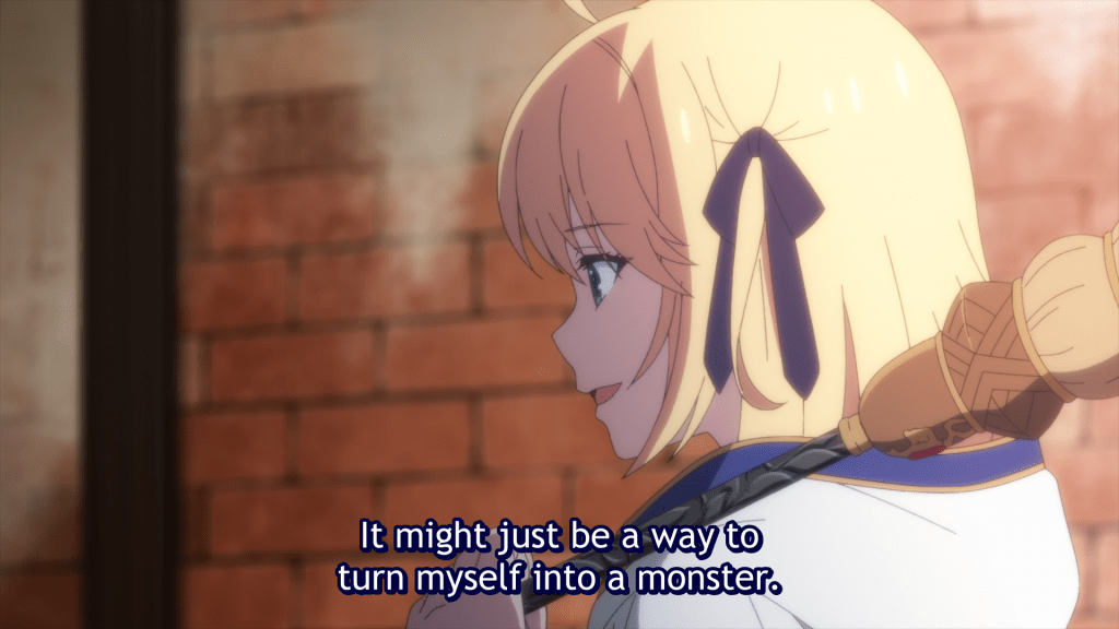It’s an emotional scene. The voice acting sells it, too; Manaka Iwami (Angel Next Door, Fruits Basket) perfectly captures Euphie’s desperation, bewilderment, sorrow, and affection for Anis in only a few lines, while Sayaka Senbongi (Bocchi the Rock!, Kabaneri) nails that mixture of reckless abandon and tender thoughtfulness that characterize Anis at her best. Not just during this scene, either—there’s a moment at the end where Anis pours everything she has into dealing the final blow to this dragon, and the passion Senbongi pours into her performance is chilling.